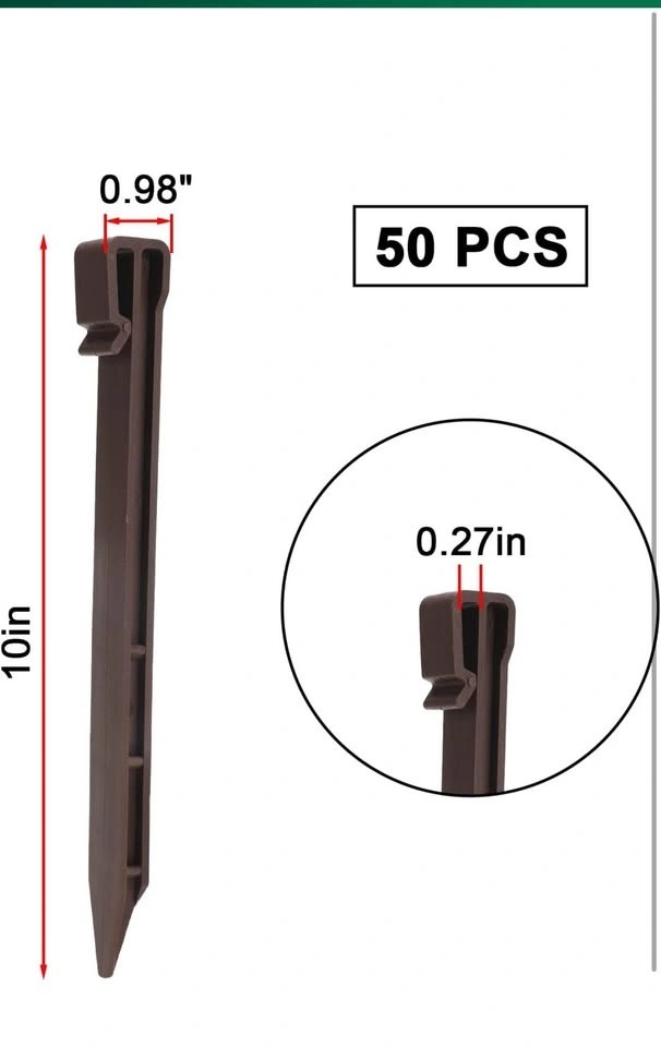 Brand new, never used. These are 50 landscape edging stakes made of quality thickened plastic that is anti-aging and durable for long-term use. They are great for fixing landscape edging, tents, weed fabric, turf, tree support, and more. The stakes have a sharp end for easy insertion into the soil and a top bayonet design for use with ropes or partitions. Perfect for DIY projects to create a scenic yard.