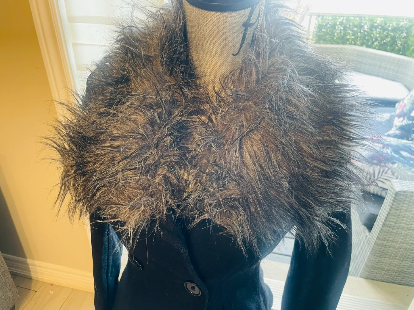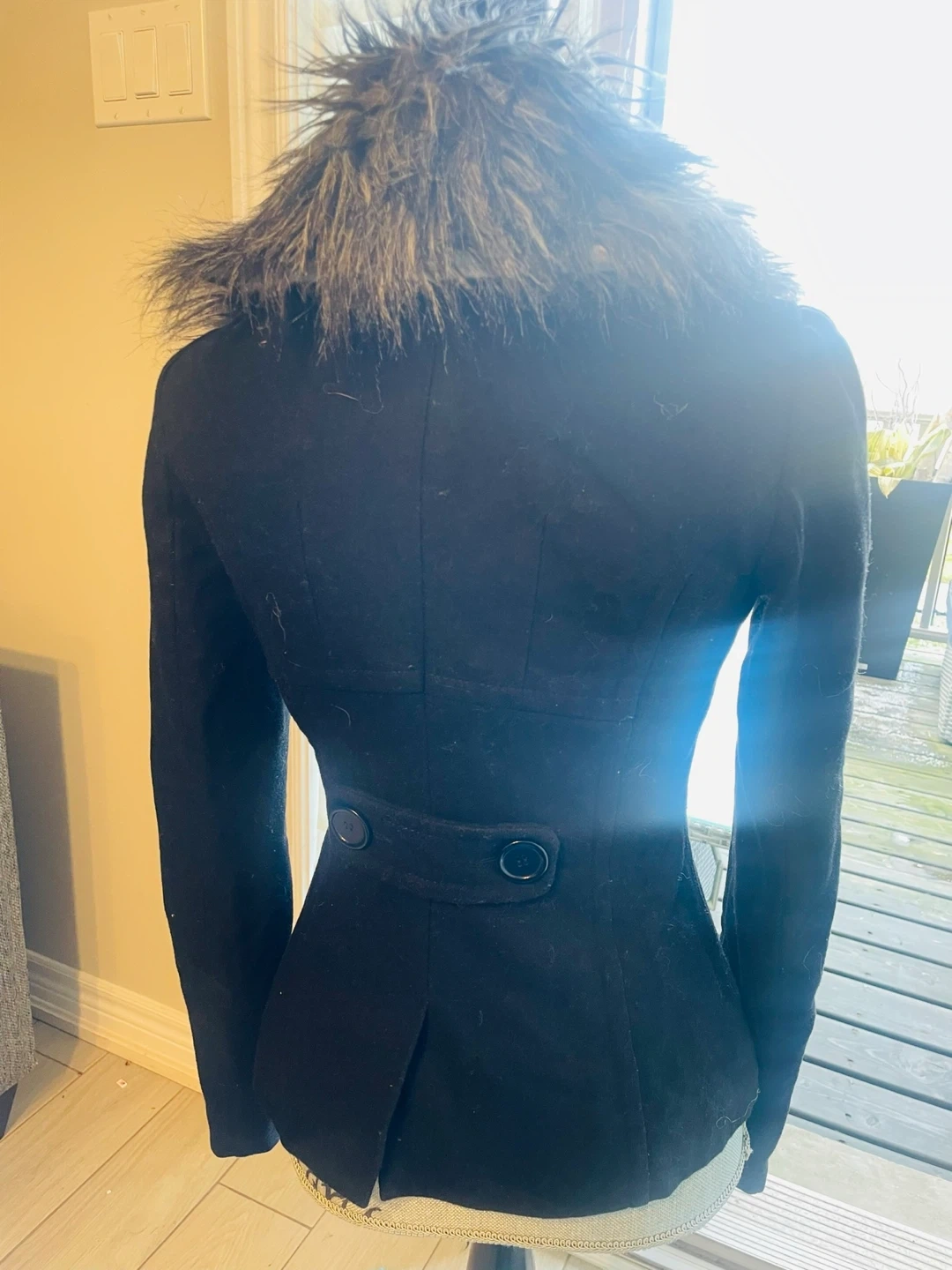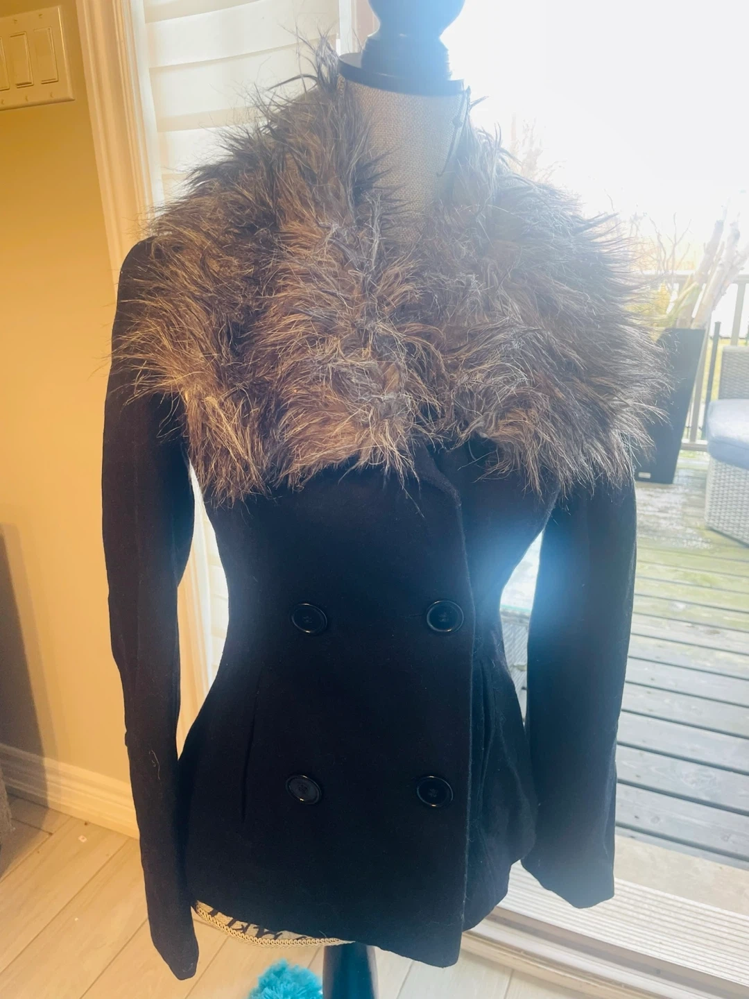 This stylish black jacket from Bebe features a plush faux fur collar. It's a double-breasted design with two button closures. The size is XS.