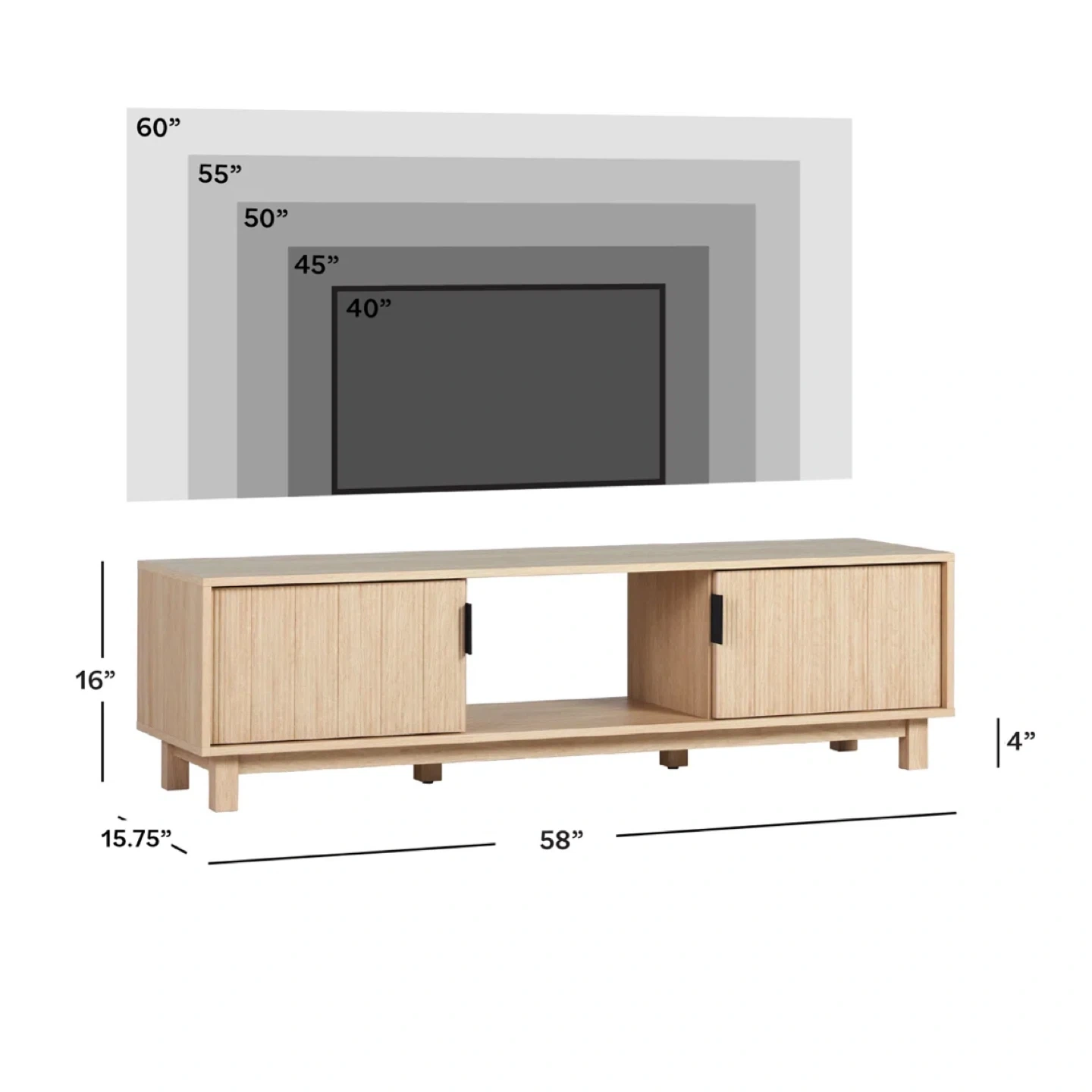 This entertainment unit features a light oak finish and slatted doors for a modern look. Plenty of storage space is available behind the doors and in the open shelving area.