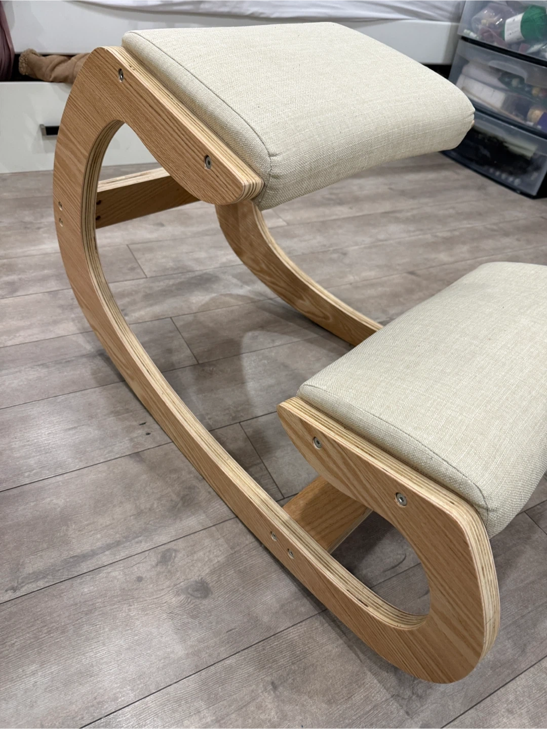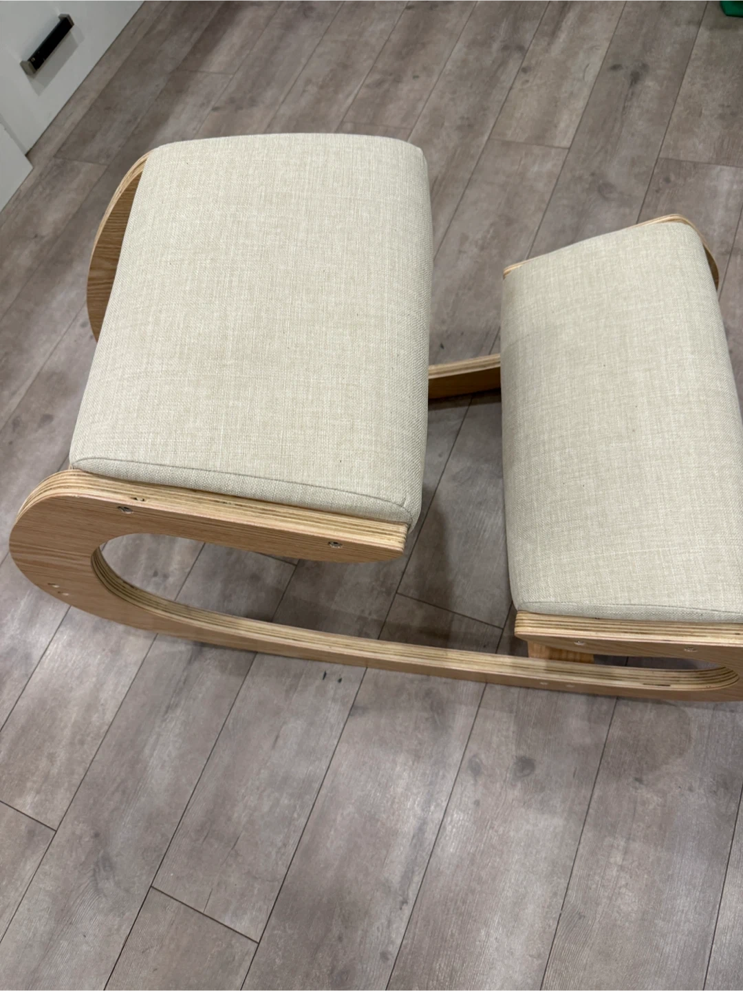 This ergonomic kneeling chair features a natural wood frame and light-coloured upholstered cushions. It's designed to promote better posture and comfort during extended sitting periods. This type of chair is useful for anyone looking to reduce lower back strain while working at a desk.