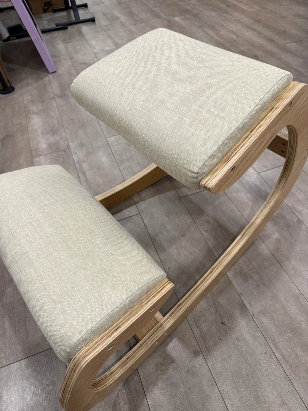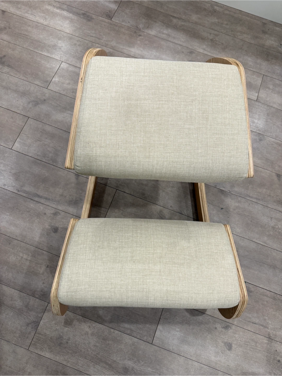 This ergonomic kneeling chair features a natural wood frame and light-coloured upholstered cushions. It's designed to promote better posture and comfort during extended sitting periods. This type of chair is useful for anyone looking to reduce lower back strain while working at a desk.