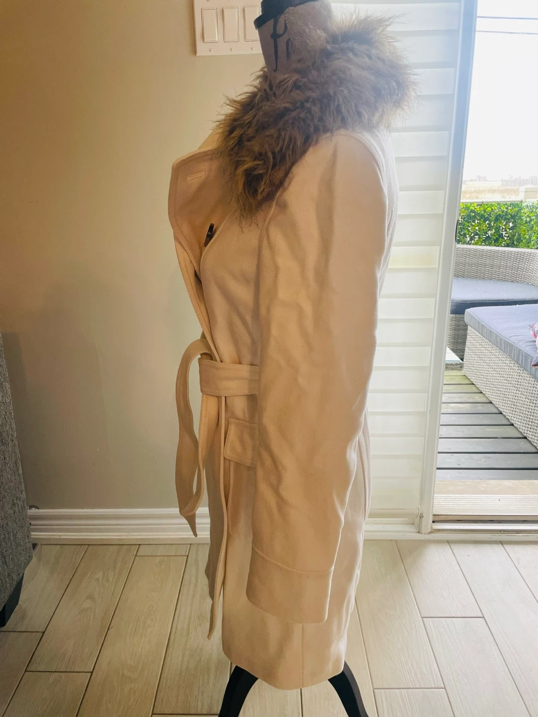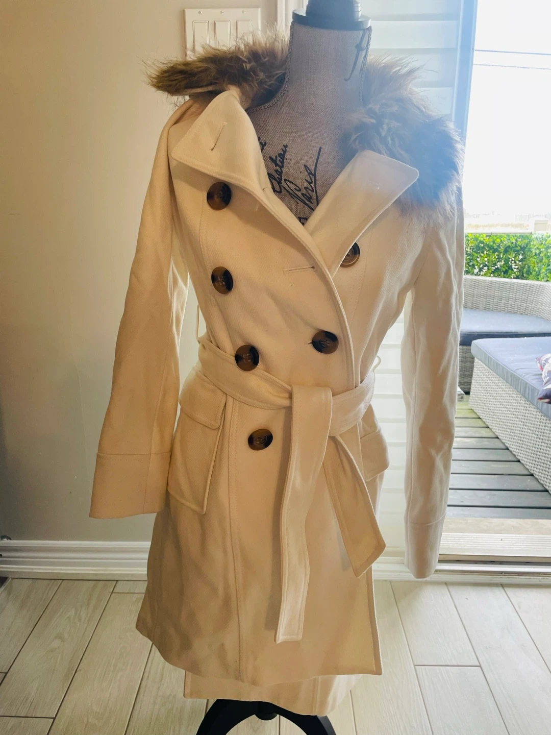This Old Navy pea coat is a cream colour and features a double-breasted front with faux fur trim on the hood. It includes a matching belt for cinching the waist. Size XS/TP.