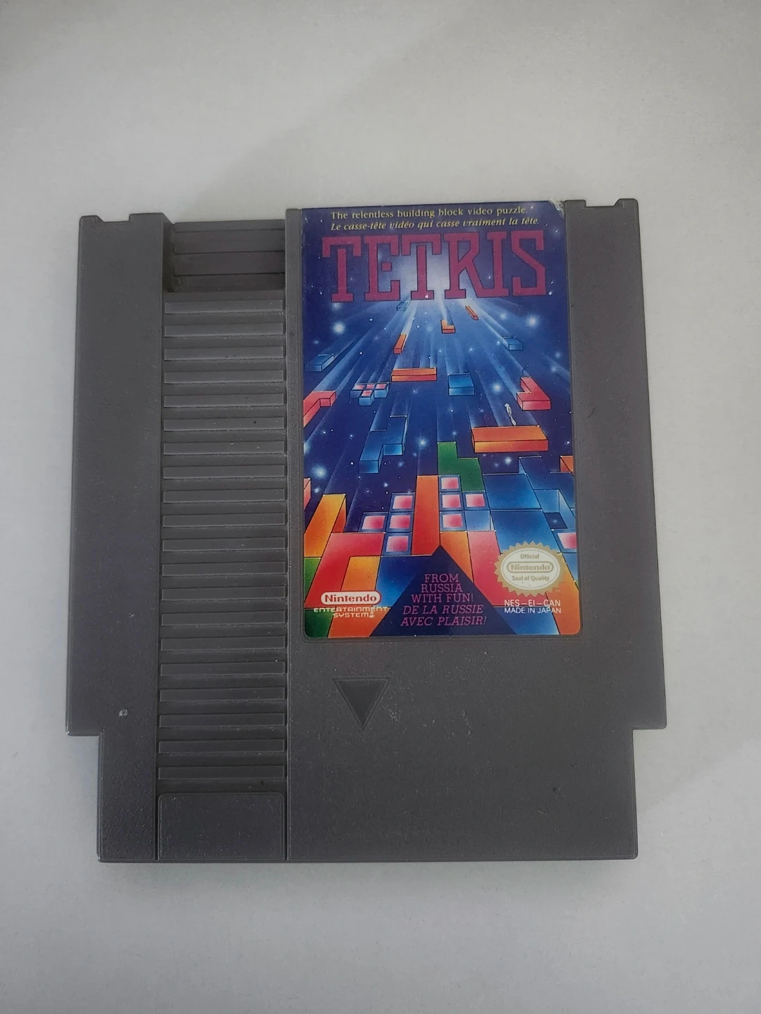 This is the classic Tetris video game for the Nintendo Entertainment System. It's a fun block puzzle game that's been entertaining players for years! The cartridge was made in Japan.