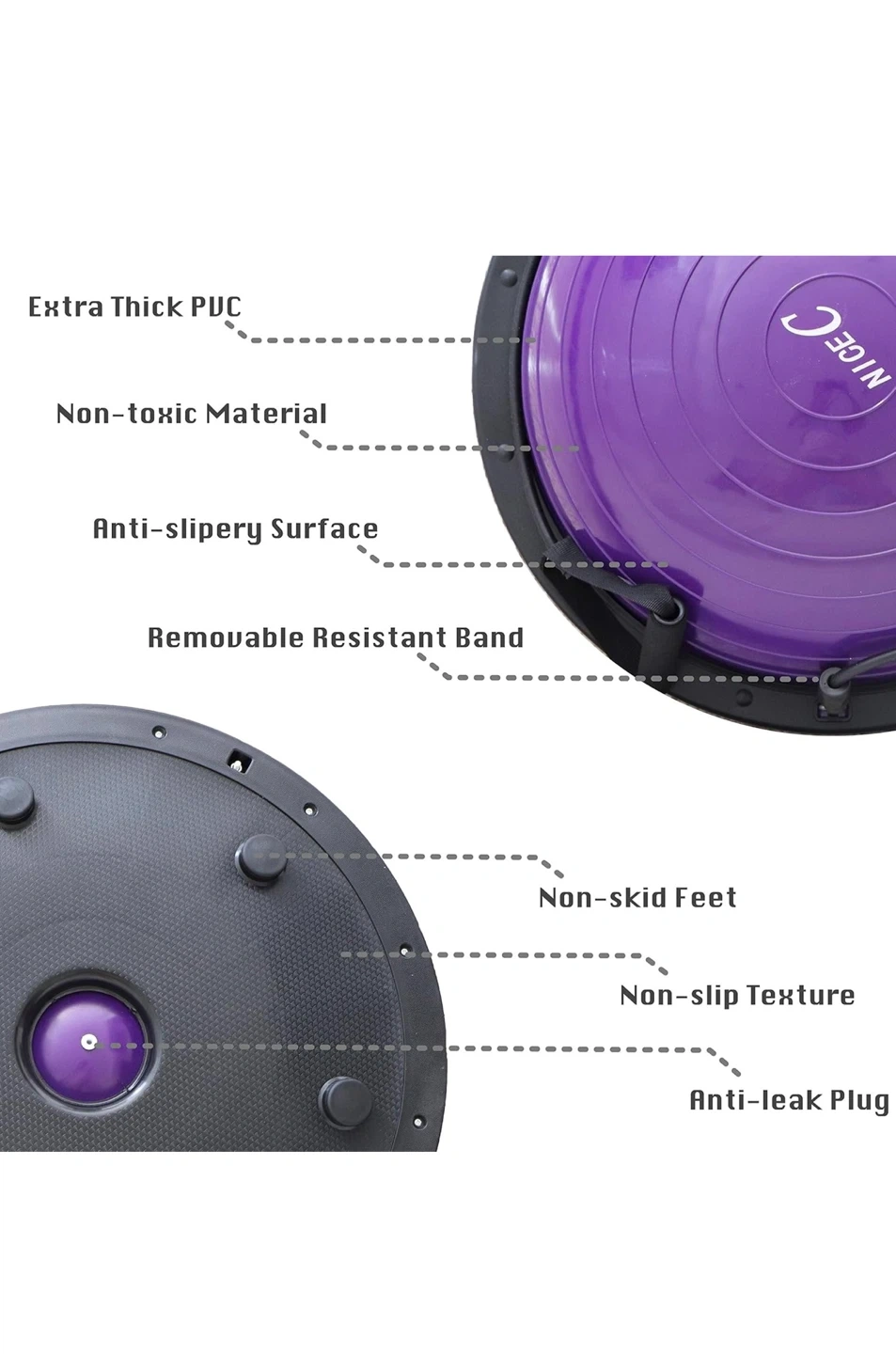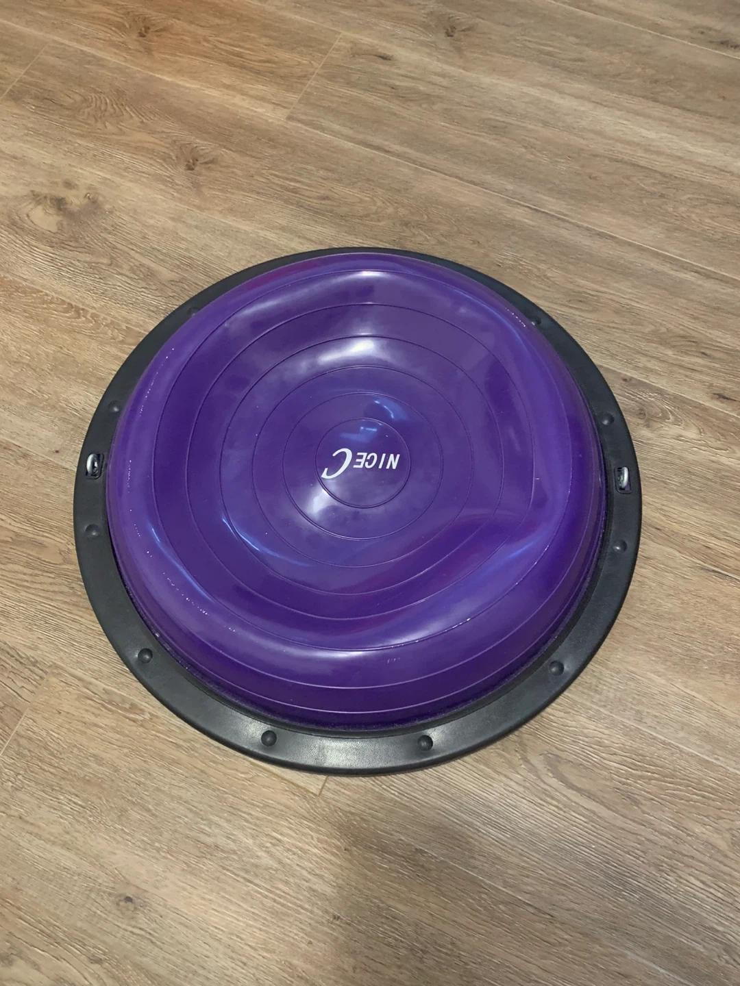 This purple balance ball is made of extra thick, non-toxic PVC with an anti-slippery surface and non-skid feet. It's 23 inches wide and 9 inches tall.