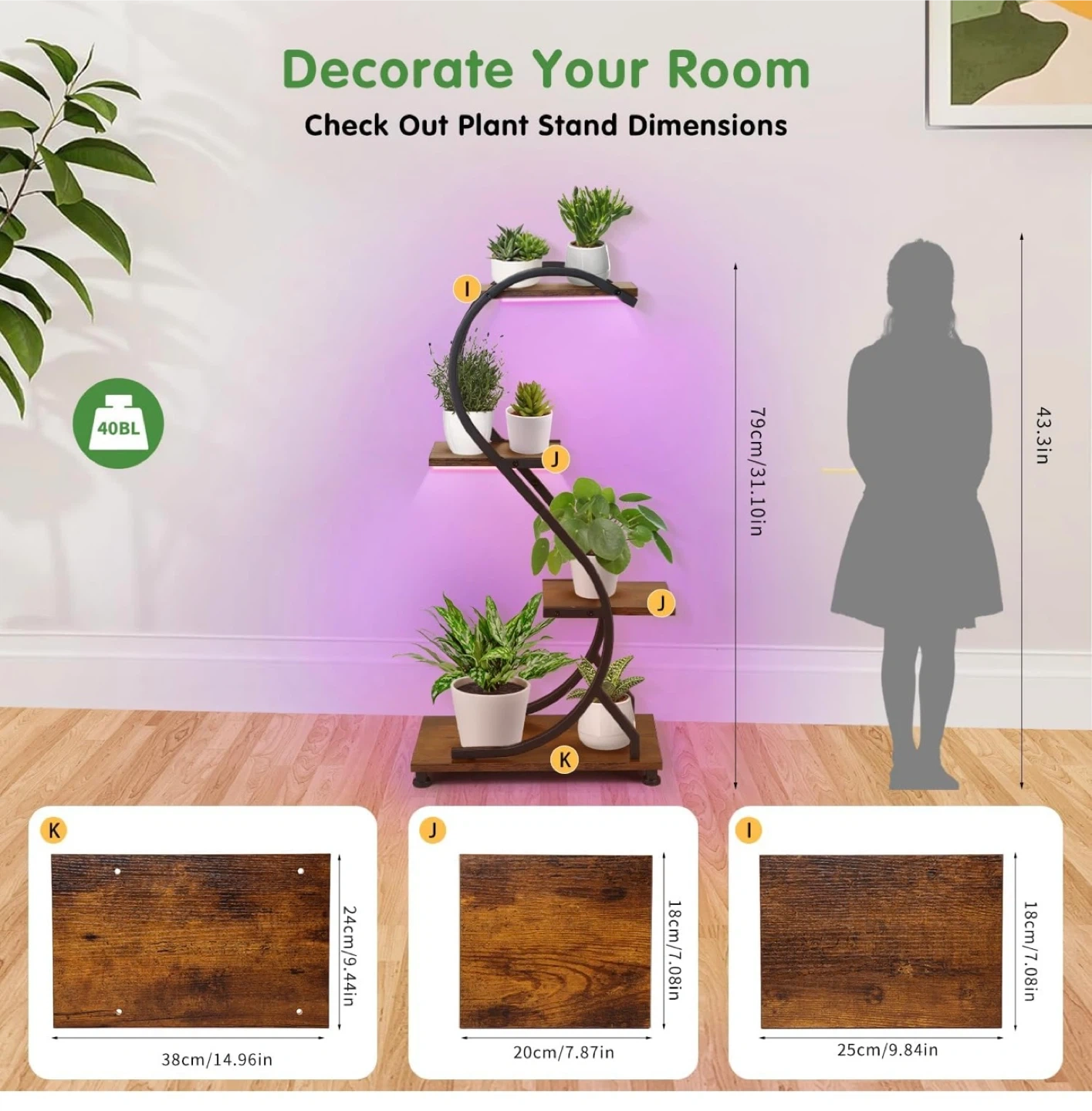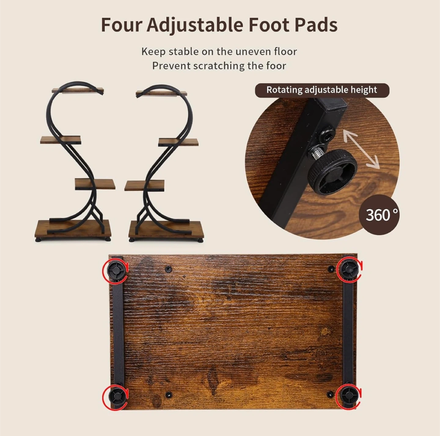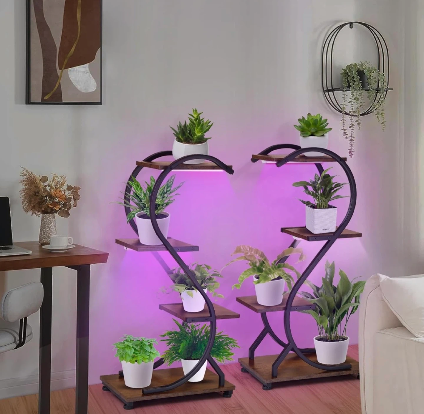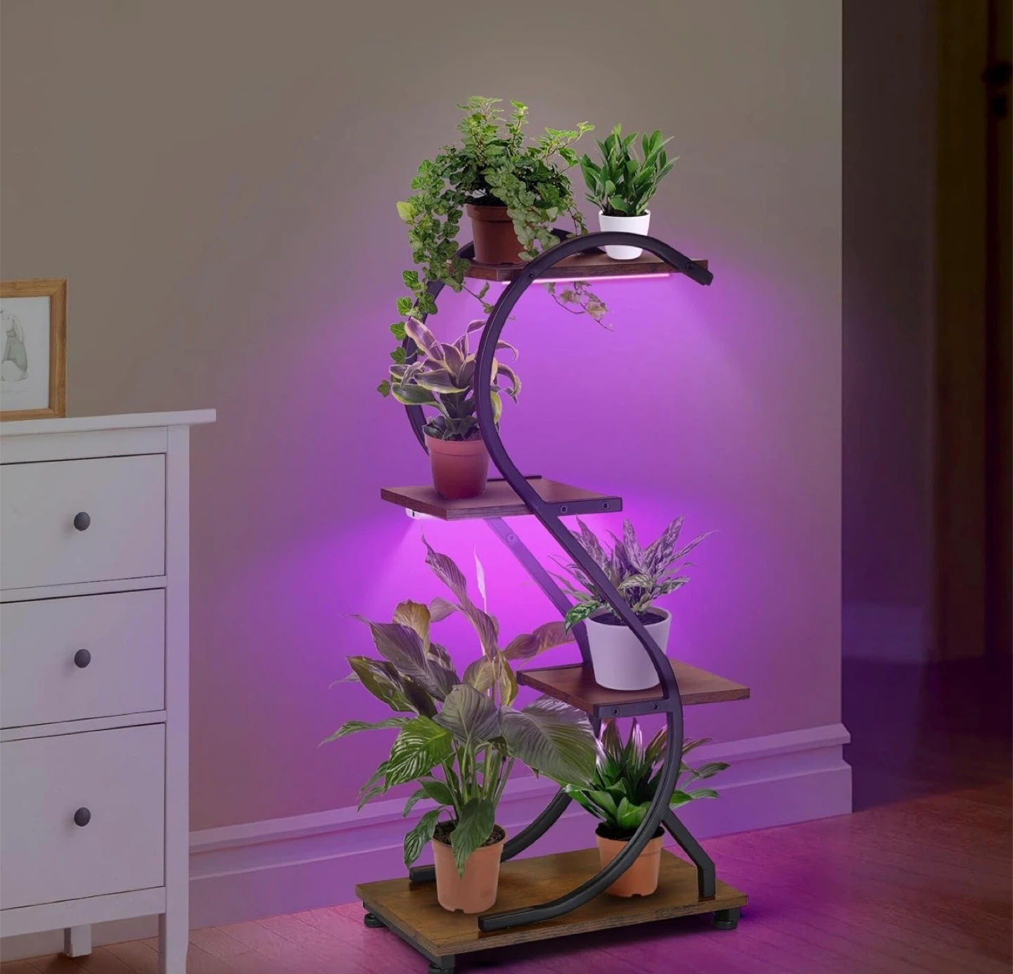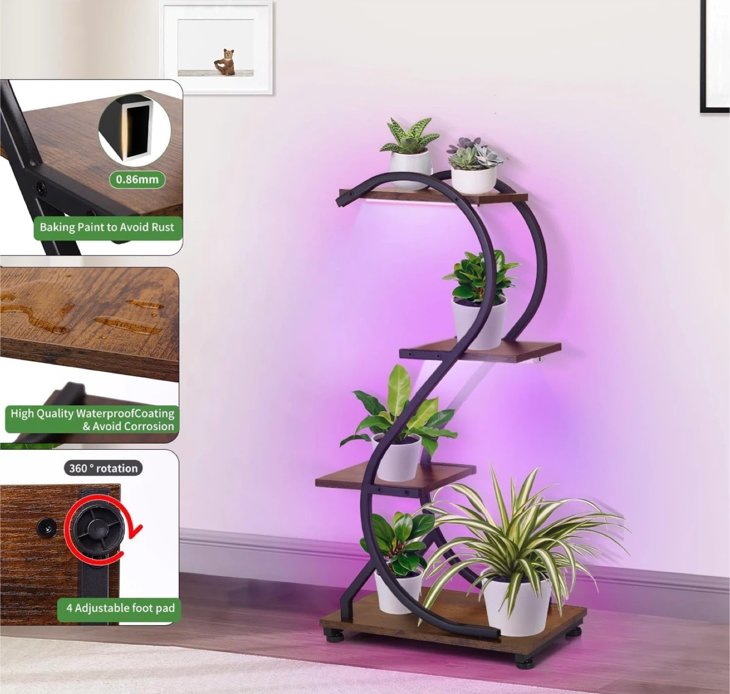 This plant stand features a unique S-shaped design with four tiers to display your plants. It includes built-in LED grow lights with adjustable brightness and timer settings. The stand is made with a baking paint finish to prevent rust and has a high-quality waterproof coating. It also features 4 adjustable foot pads for stability.