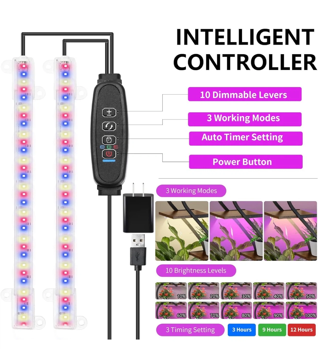 This plant stand features a unique S-shaped design with four tiers to display your plants. It includes built-in LED grow lights with adjustable brightness and timer settings. The stand is made with a baking paint finish to prevent rust and has a high-quality waterproof coating. It also features 4 adjustable foot pads for stability.