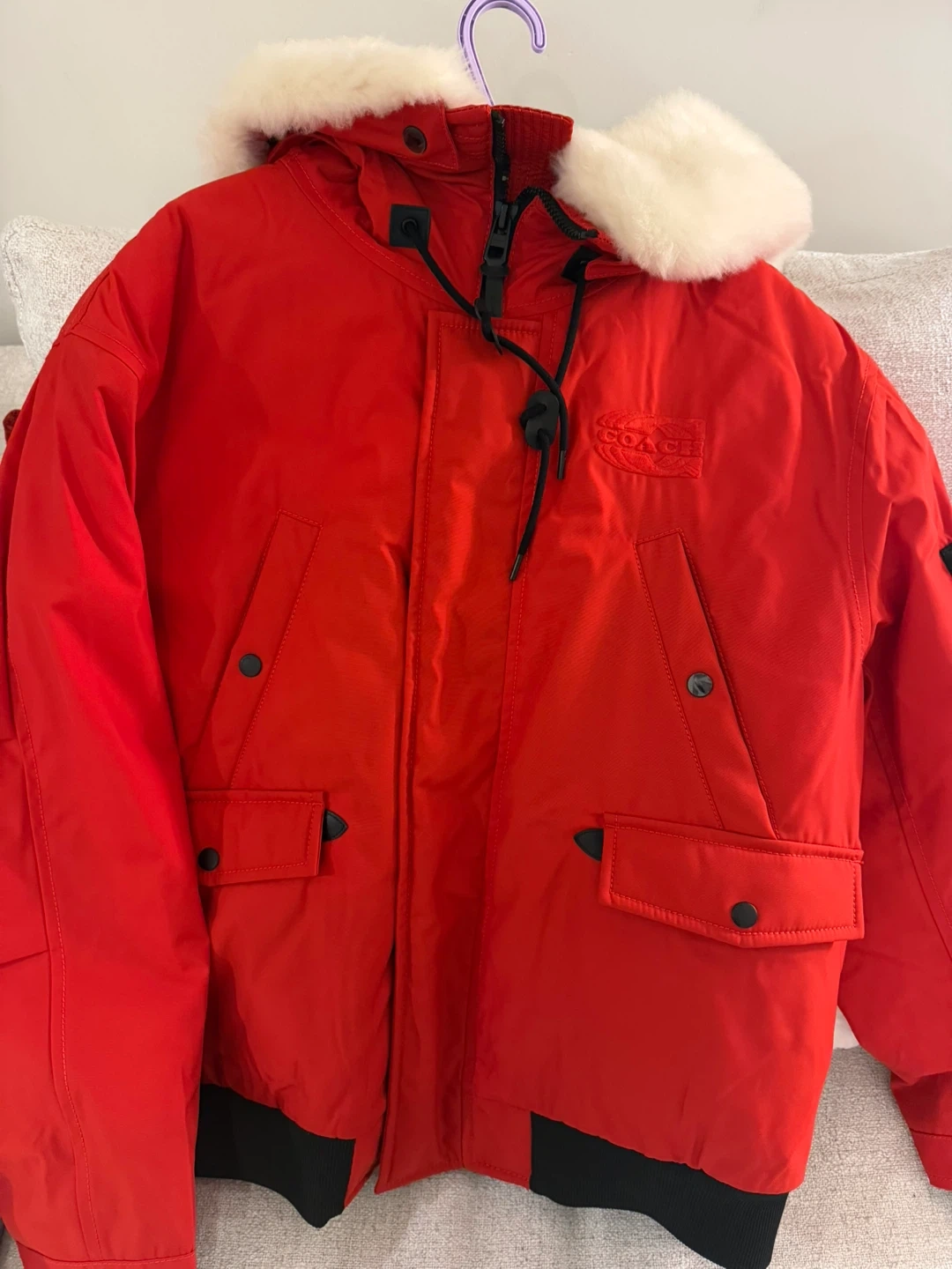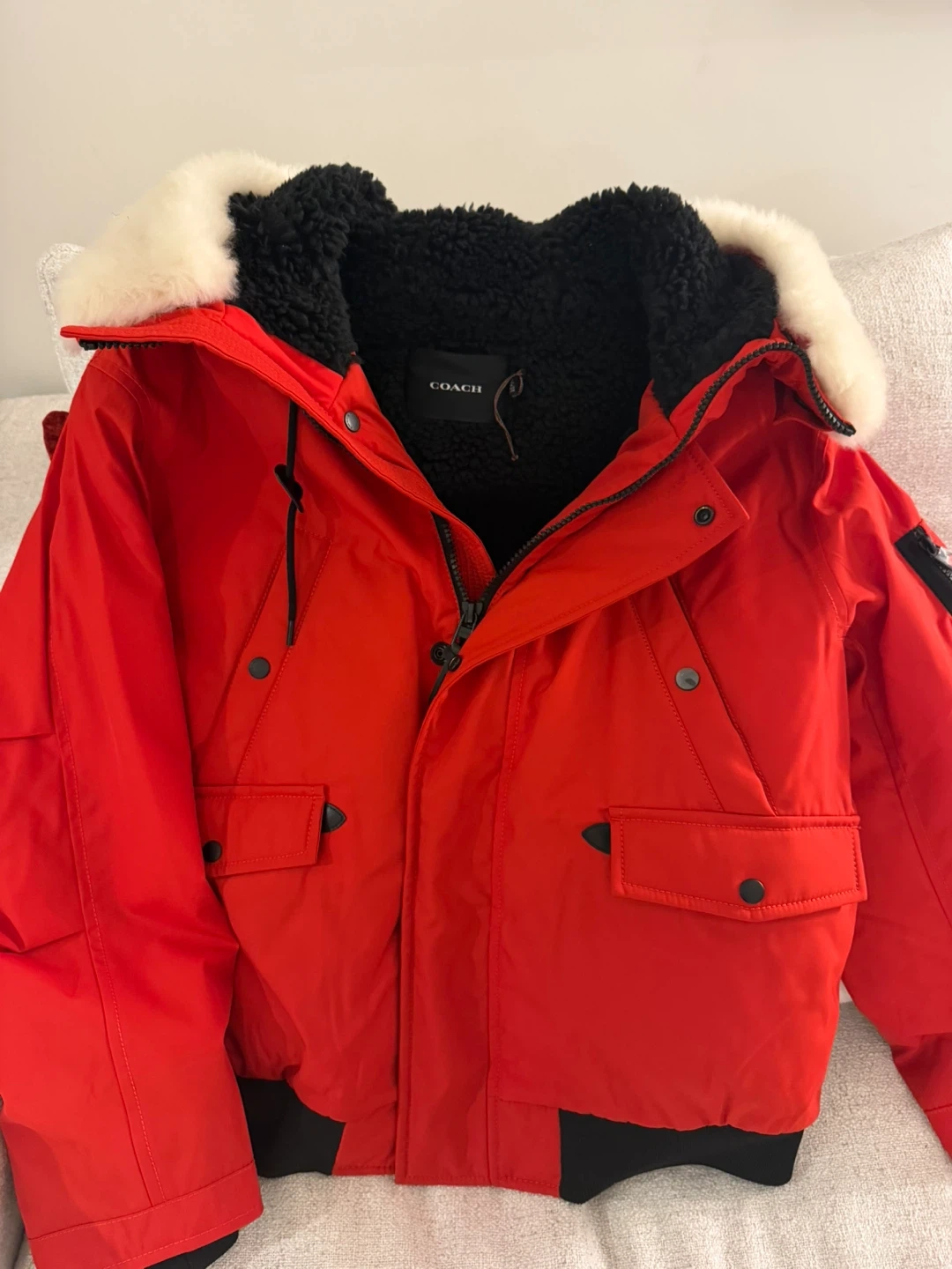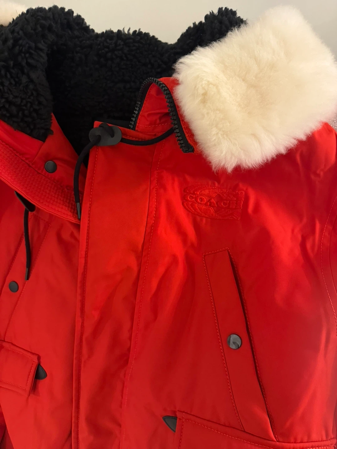 This is a COACH red parka jacket. It features a black sherpa lining and a cream-coloured fur trim on the hood. Multiple pockets and a zipper closure are present.