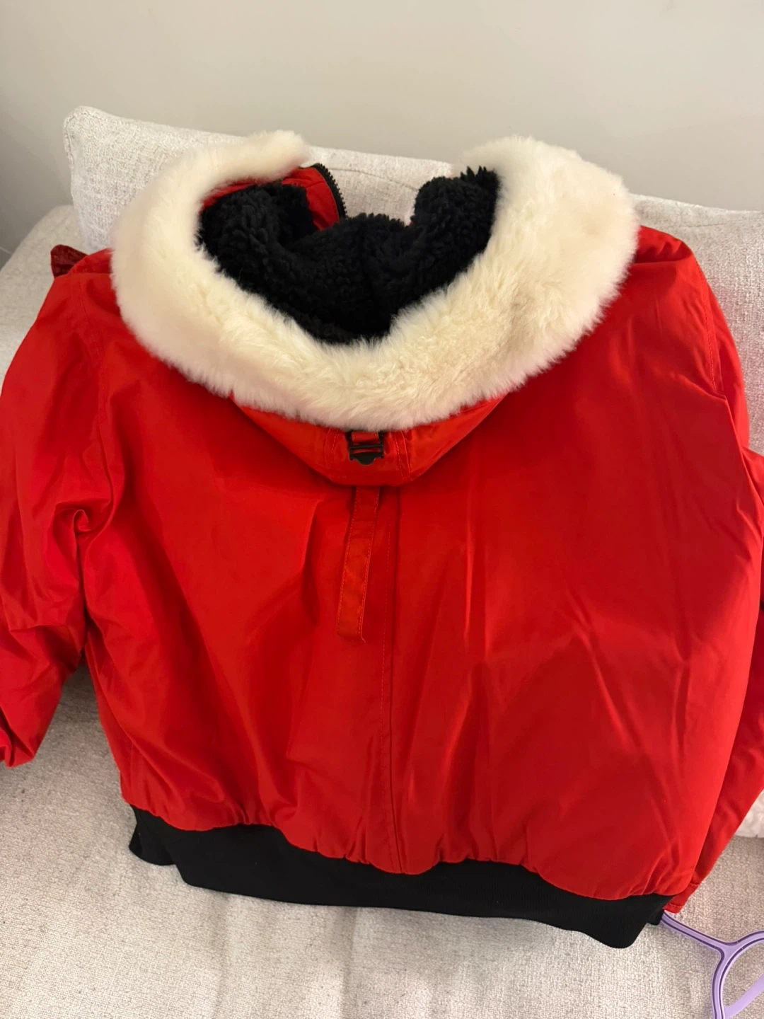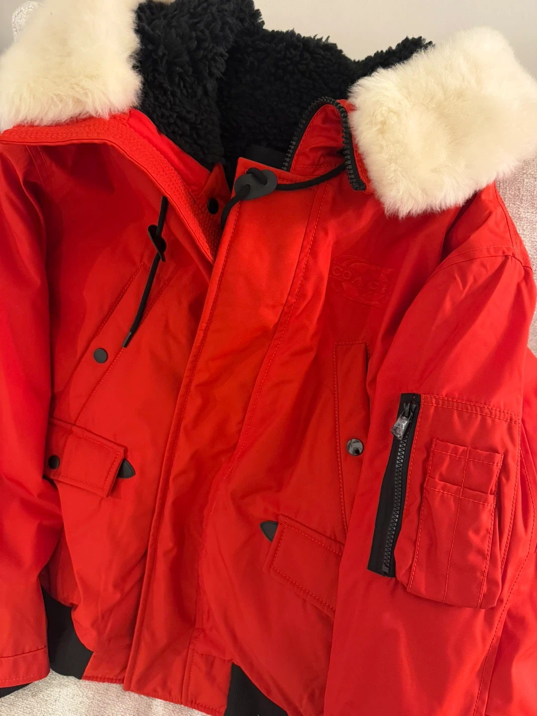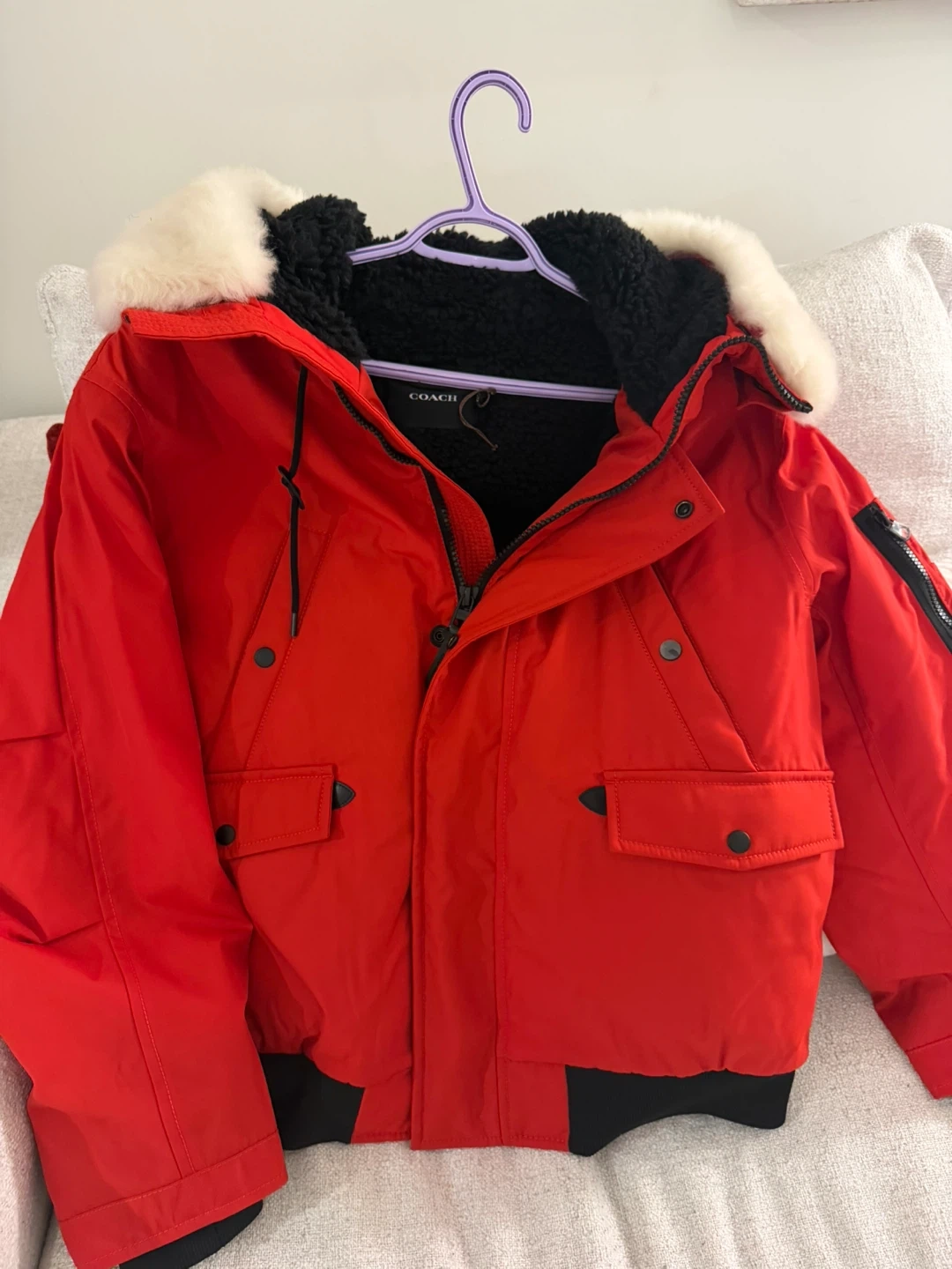 This is a COACH red parka jacket. It features a black sherpa lining and a cream-coloured fur trim on the hood. Multiple pockets and a zipper closure are present.