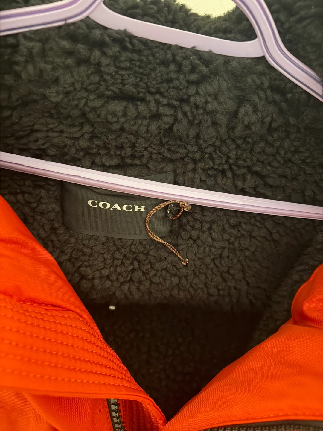This is a COACH red parka jacket. It features a black sherpa lining and a cream-coloured fur trim on the hood. Multiple pockets and a zipper closure are present.
