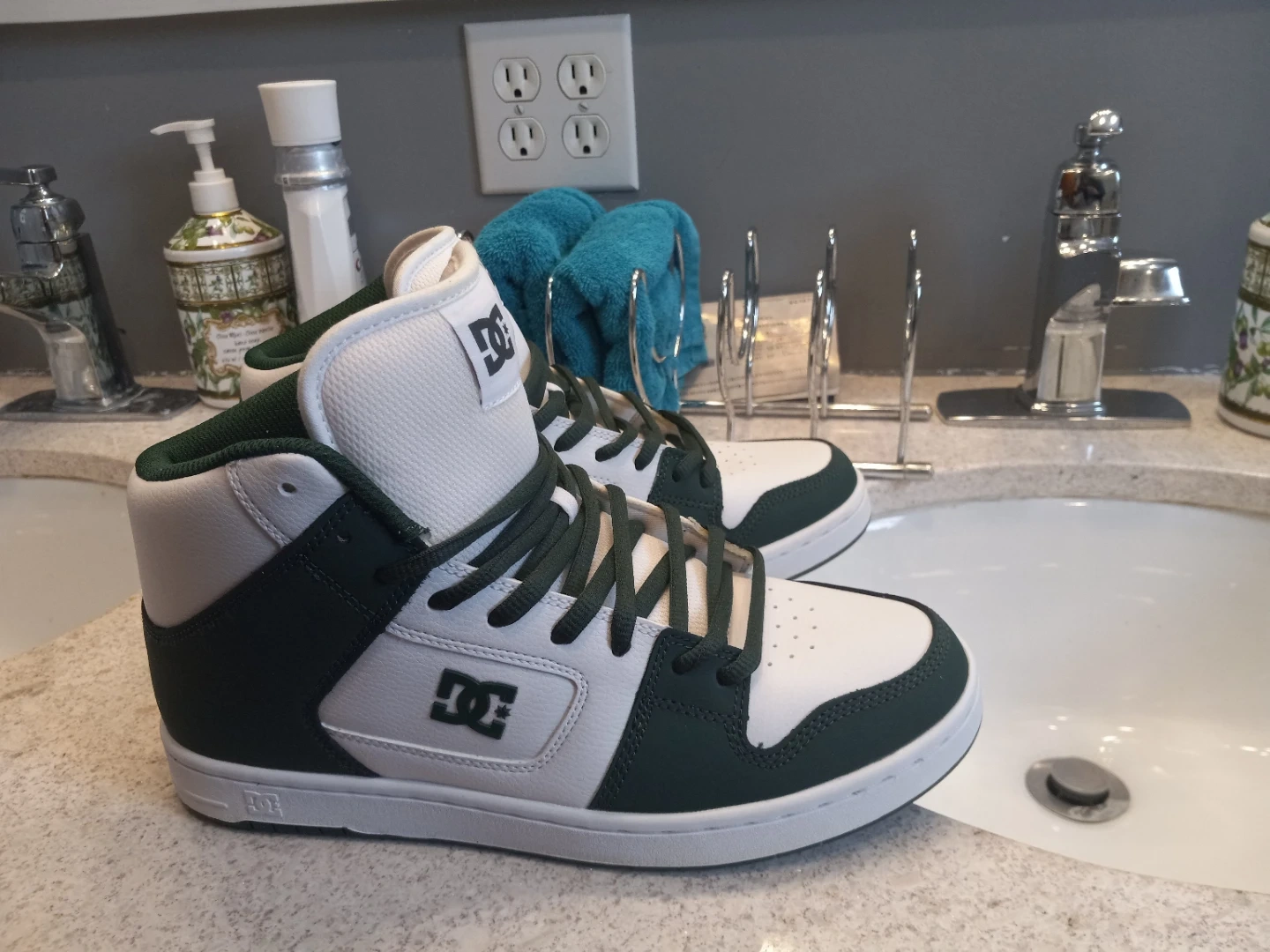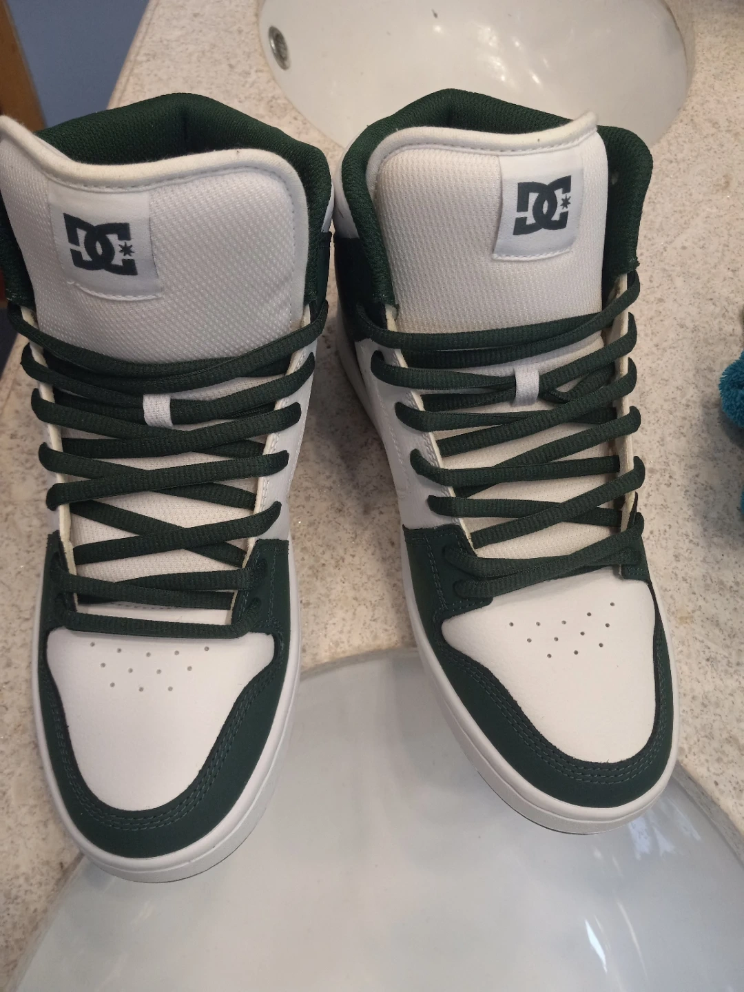 Brand new ,never worn DC high top shoes . For some reason the green looks alot darker in the picture . They are a really nice shoe . I just ought wrong size by mistake .
