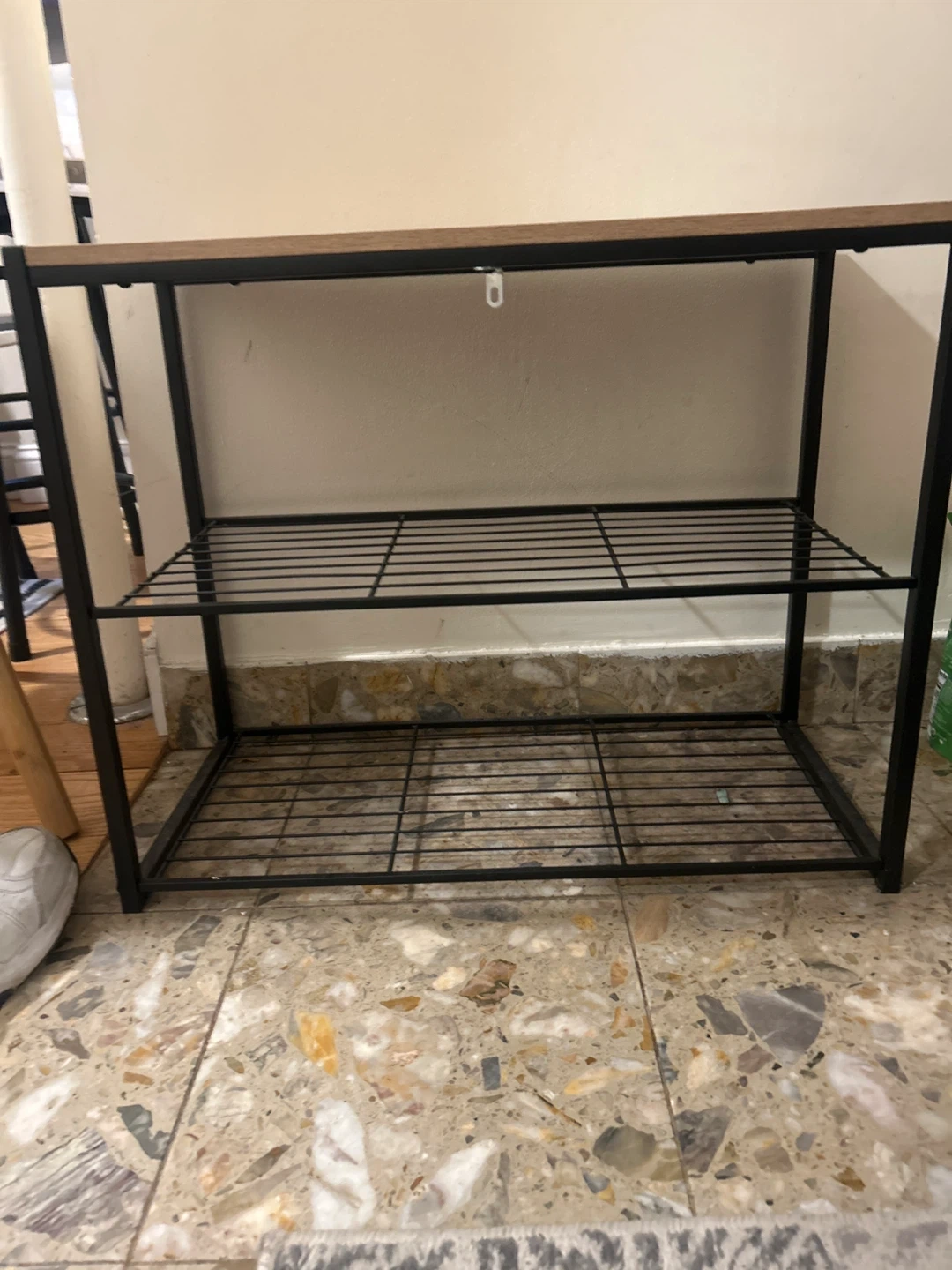 This shelf unit features a black metal frame with a wood-look top shelf and two wire grid shelves. It's a simple, functional storage solution. Metal frame construction. Wood composite top. Great for storing shoes!