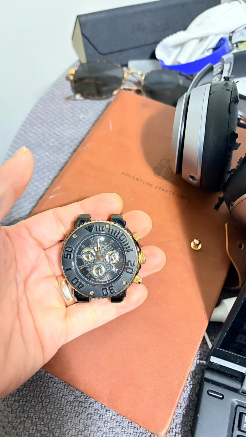 Mulco chronograph watch with a black and gold design. It features multiple subdials and gold-tone accents. This watch offers a stylish look for any occasion. Selling for part or fixed. Open for offers