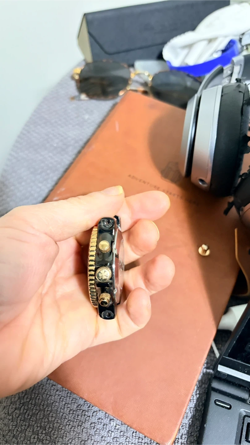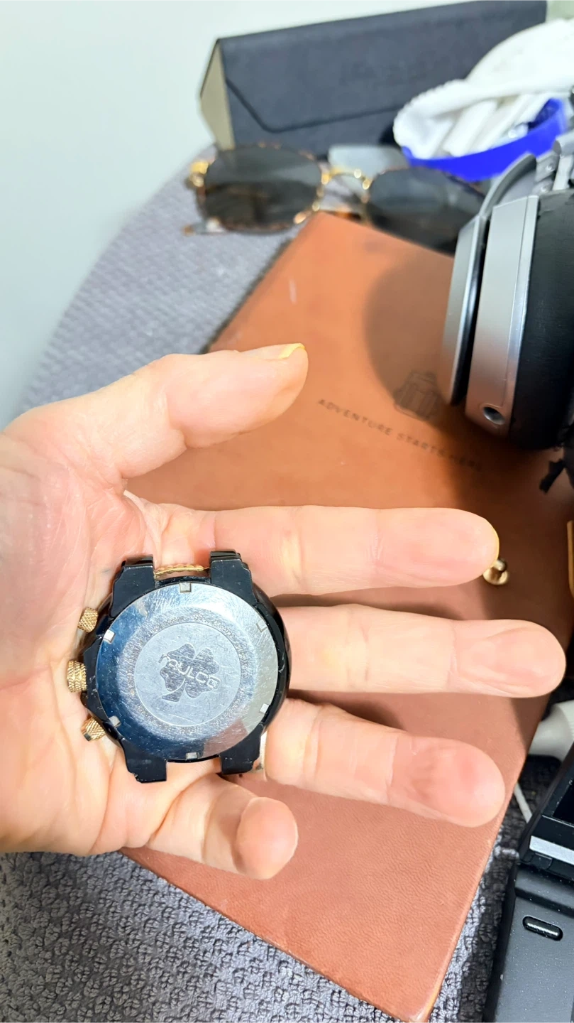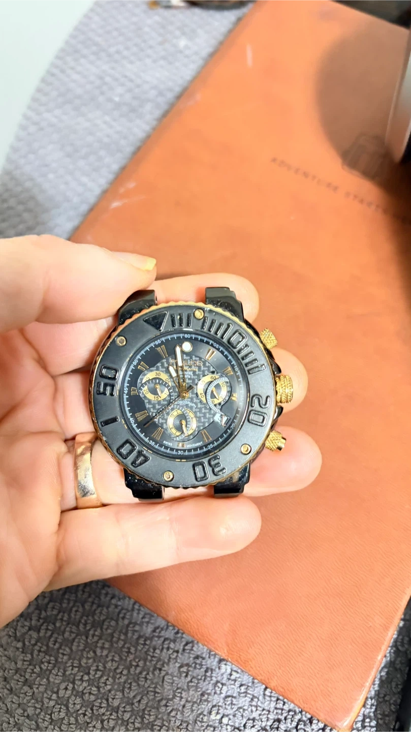 Mulco chronograph watch with a black and gold design. It features multiple subdials and gold-tone accents. This watch offers a stylish look for any occasion. Selling for part or fixed. Open for offers