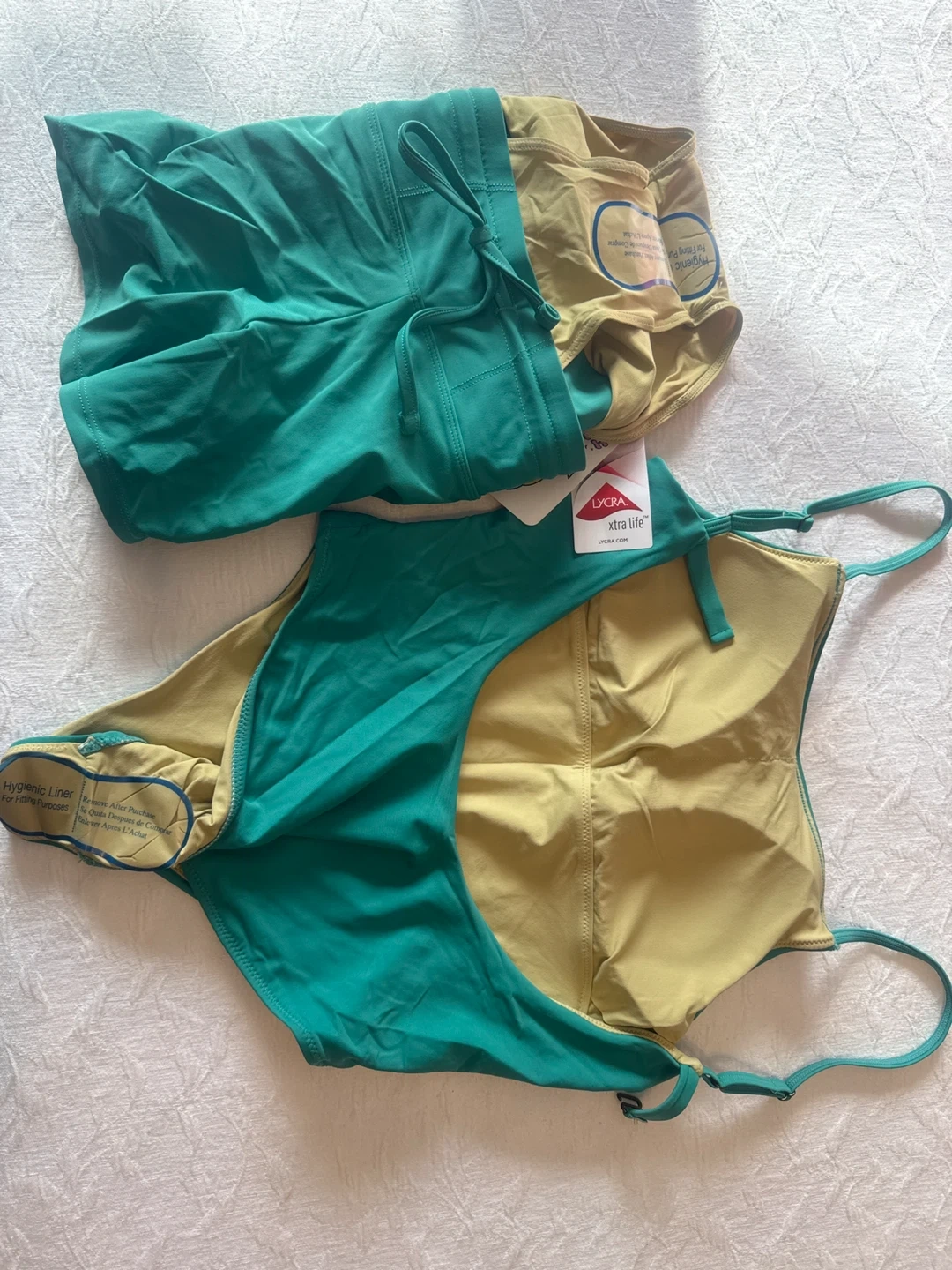 TYR performance swimwear set in teal green. Includes one-piece swimsuit, ruffled skirt and swim shorts. They are all size medium and made with Lycra Xtra Life fabric. Comes with original tags attached. Never used (New)