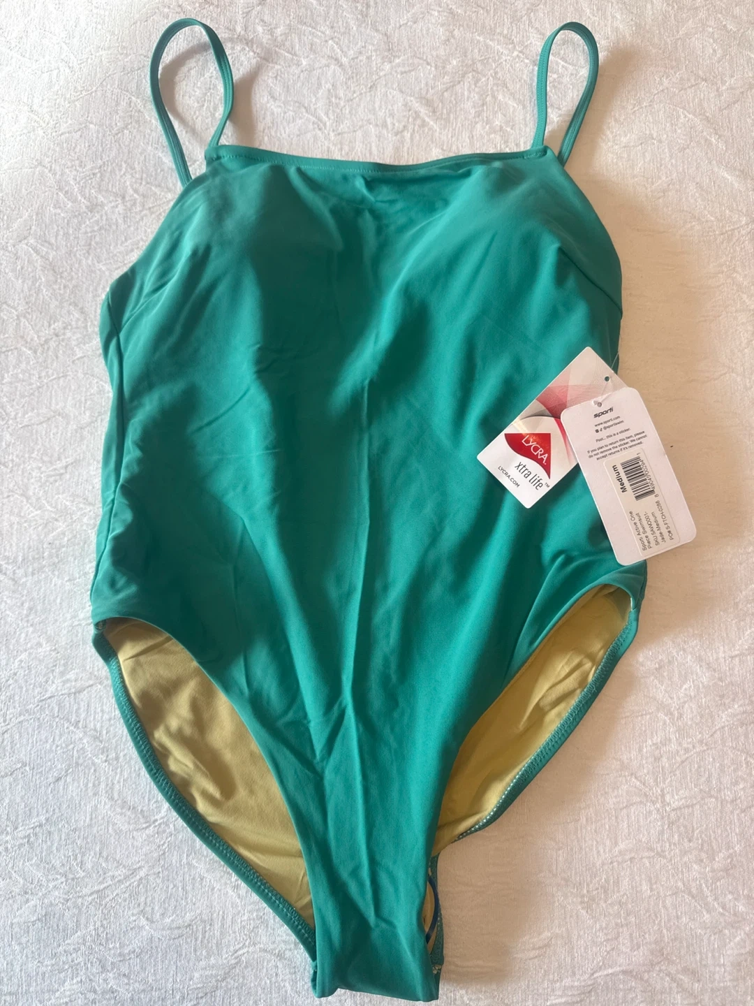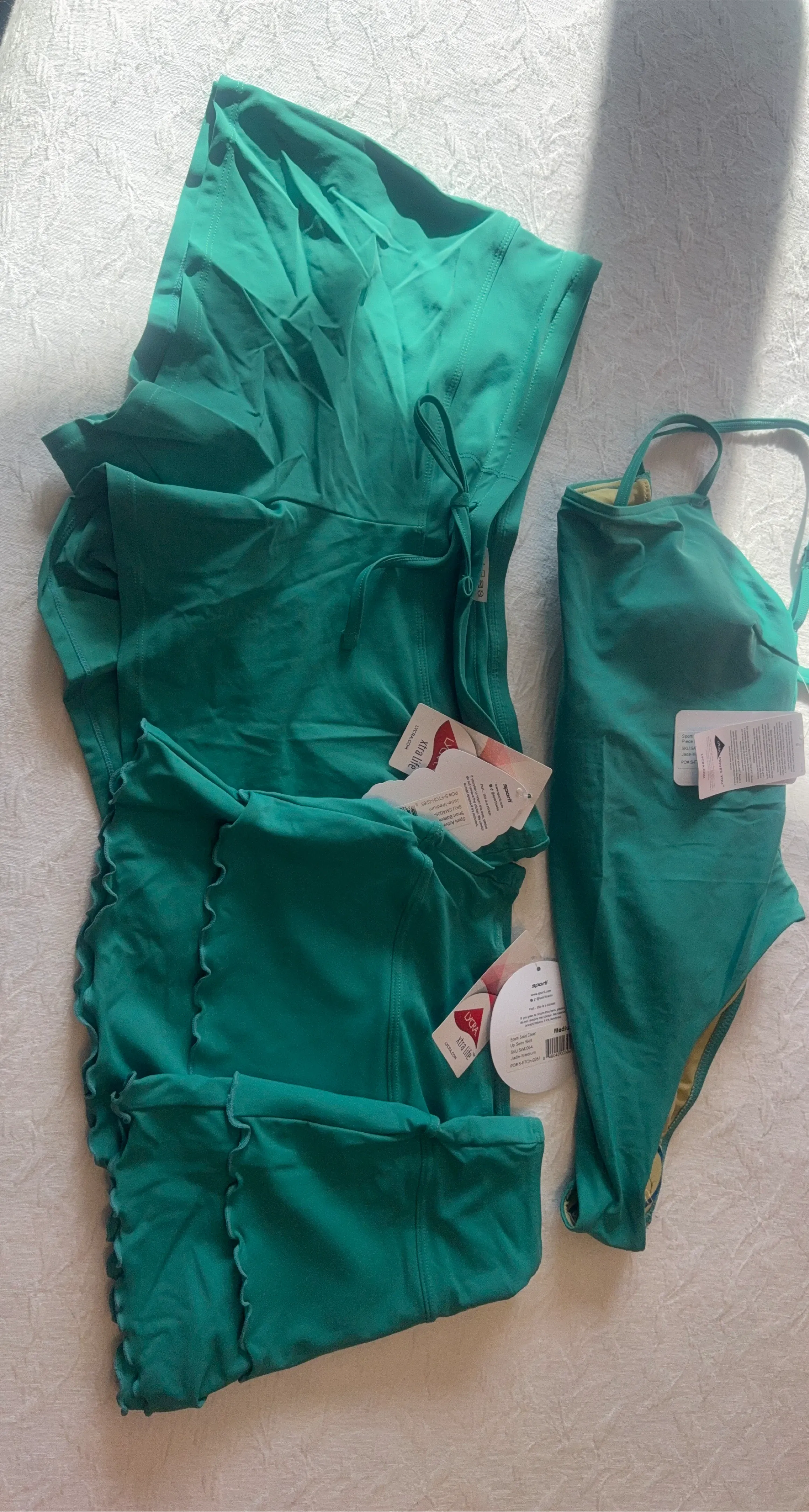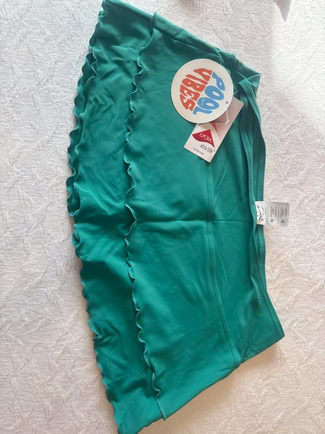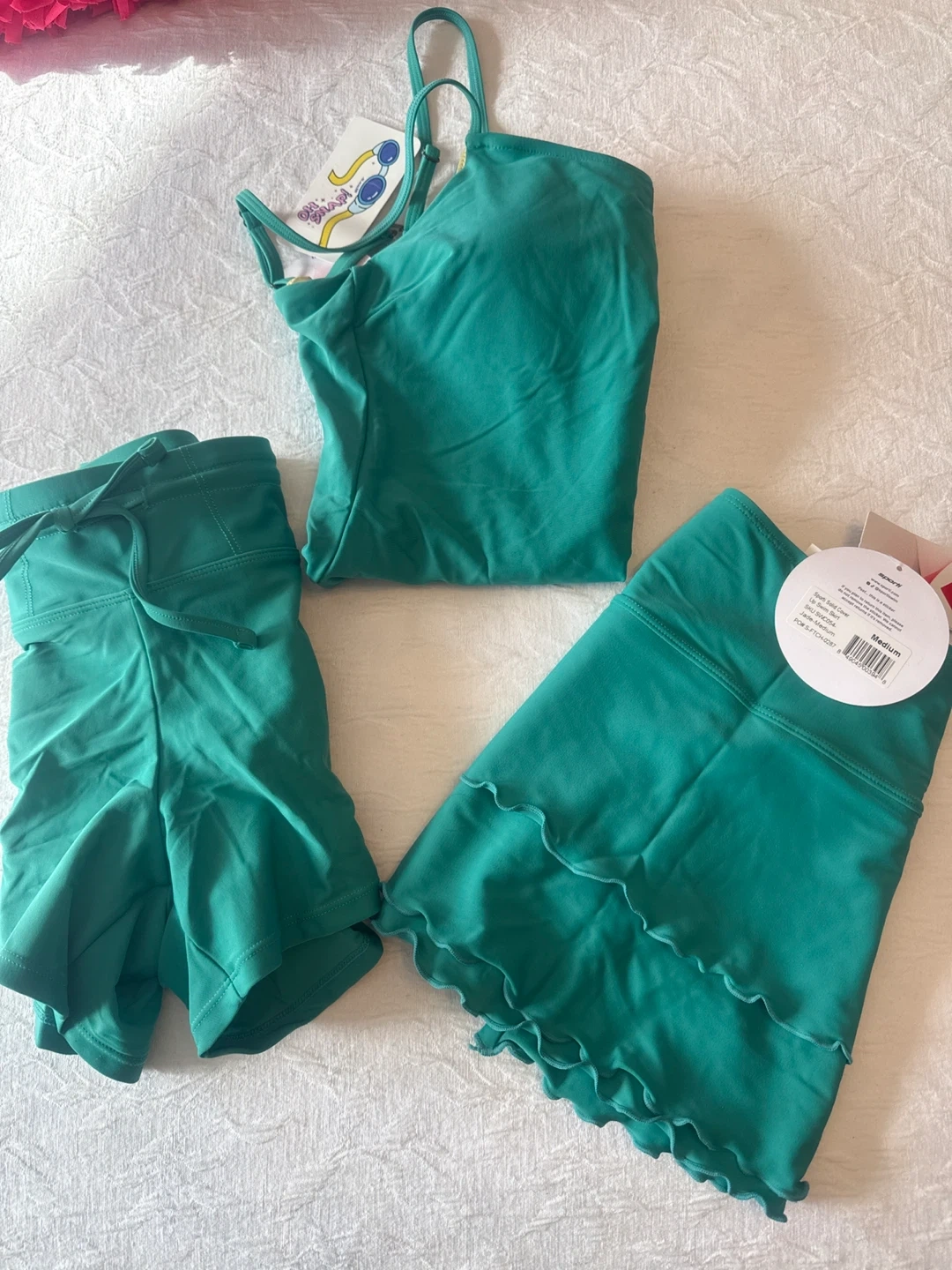TYR performance swimwear set in teal green. Includes one-piece swimsuit, ruffled skirt and swim shorts. They are all size medium and made with Lycra Xtra Life fabric. Comes with original tags attached. Never used (New)