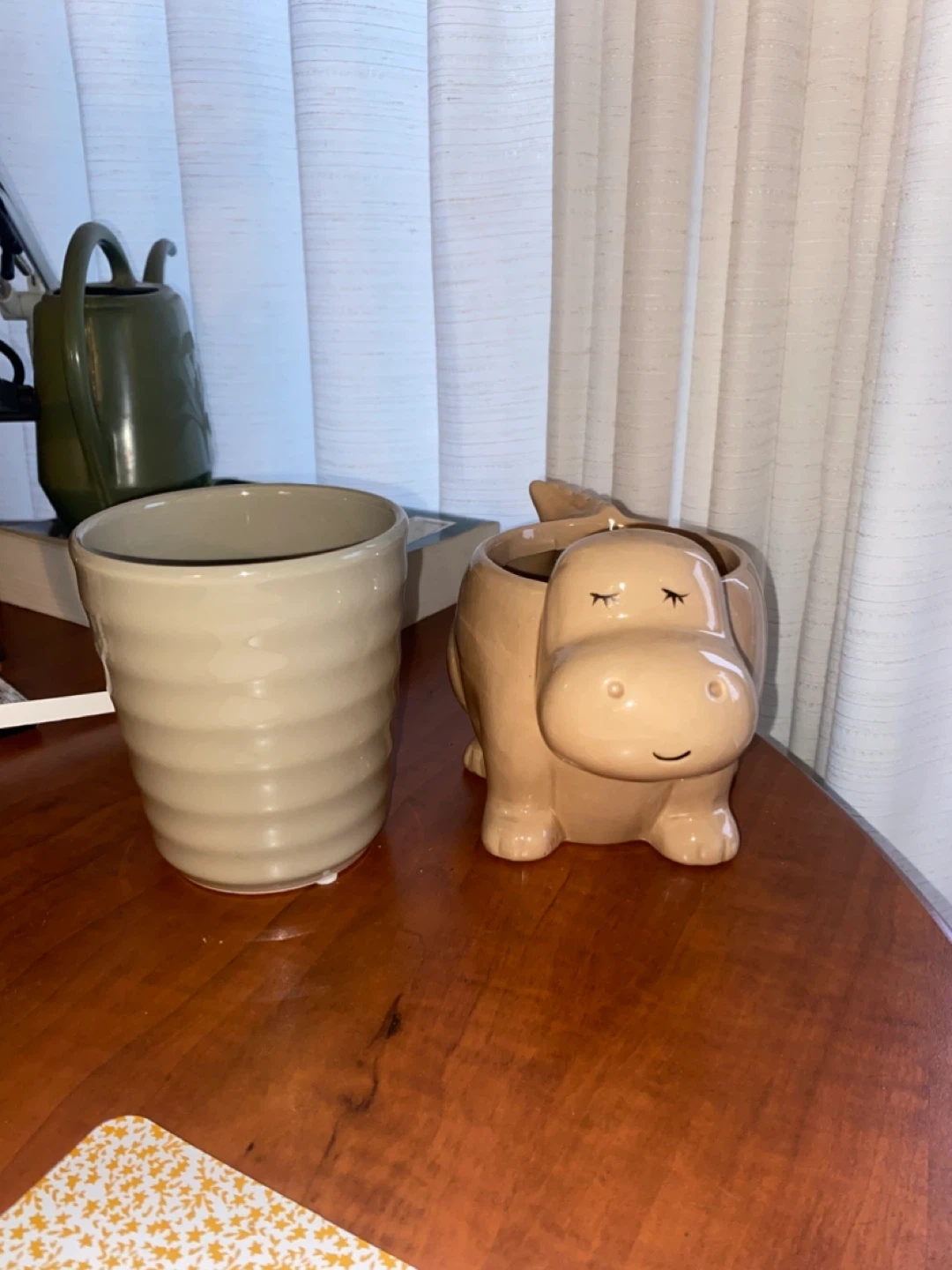 Two ceramic pots for plants or décor. Includes a beige ribbed pot and a cute beige dinosaur -shaped pot. These pots are a lovely neutral addition to any home!