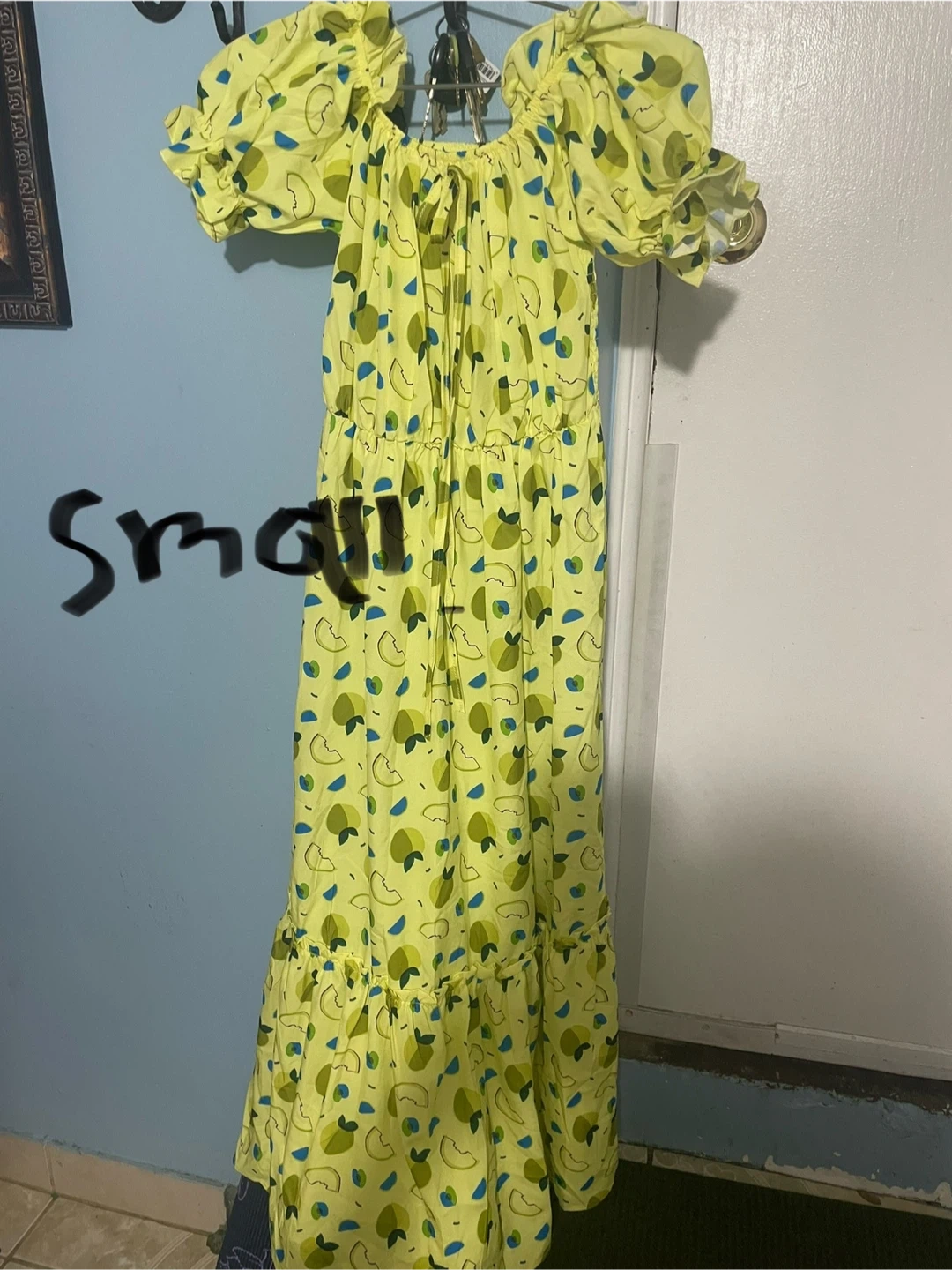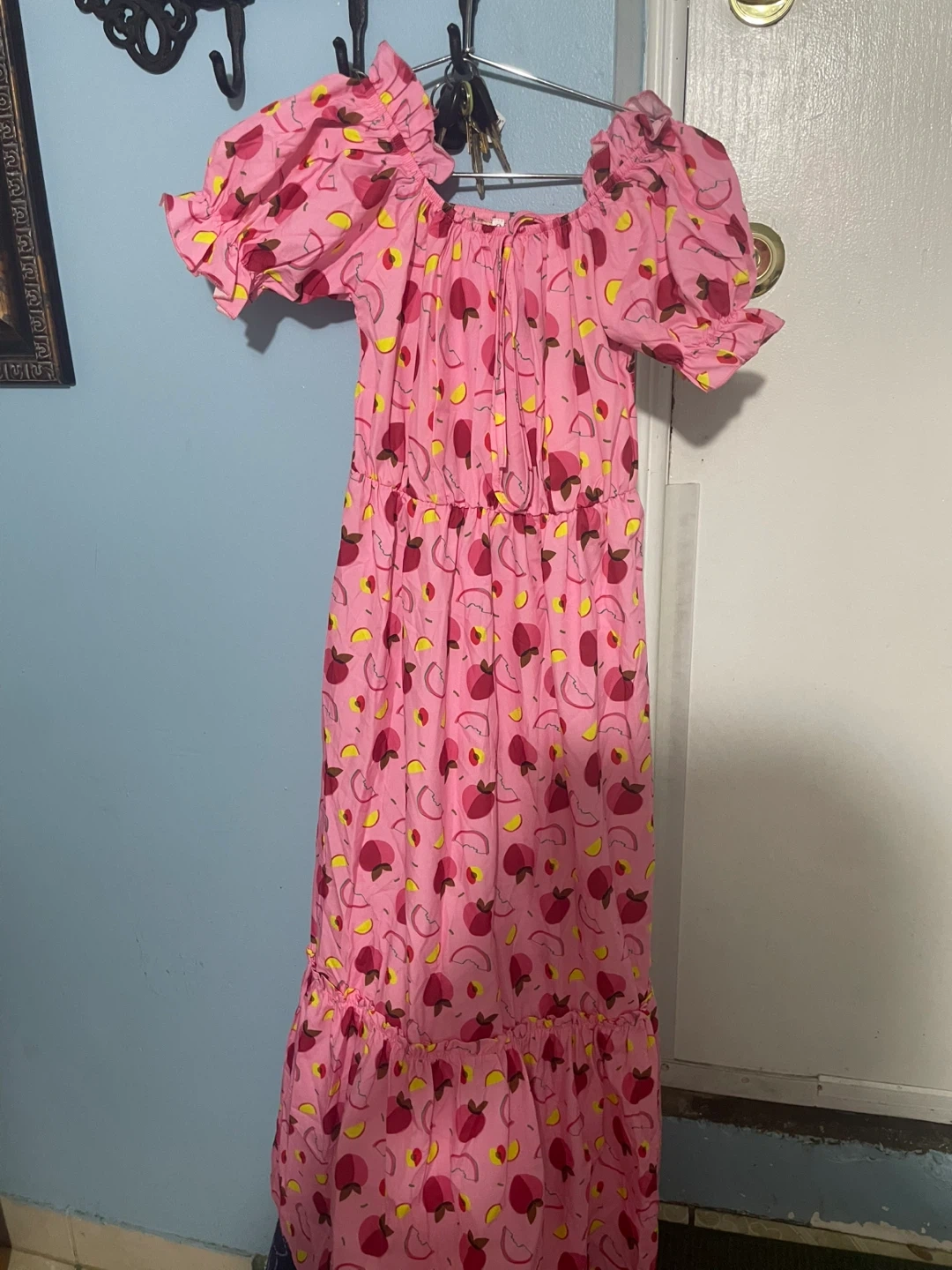 This women's maxi dress features an off-the-shoulder neckline with puff sleeves. It has a smocked waist and a tiered, ruffled hem. The dress is made of a lightweight fabric with a fruit print. Available in sizes S, M, L, XL, and XXL.