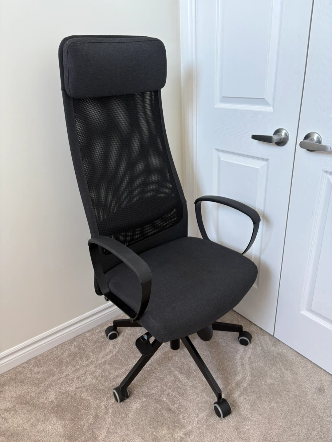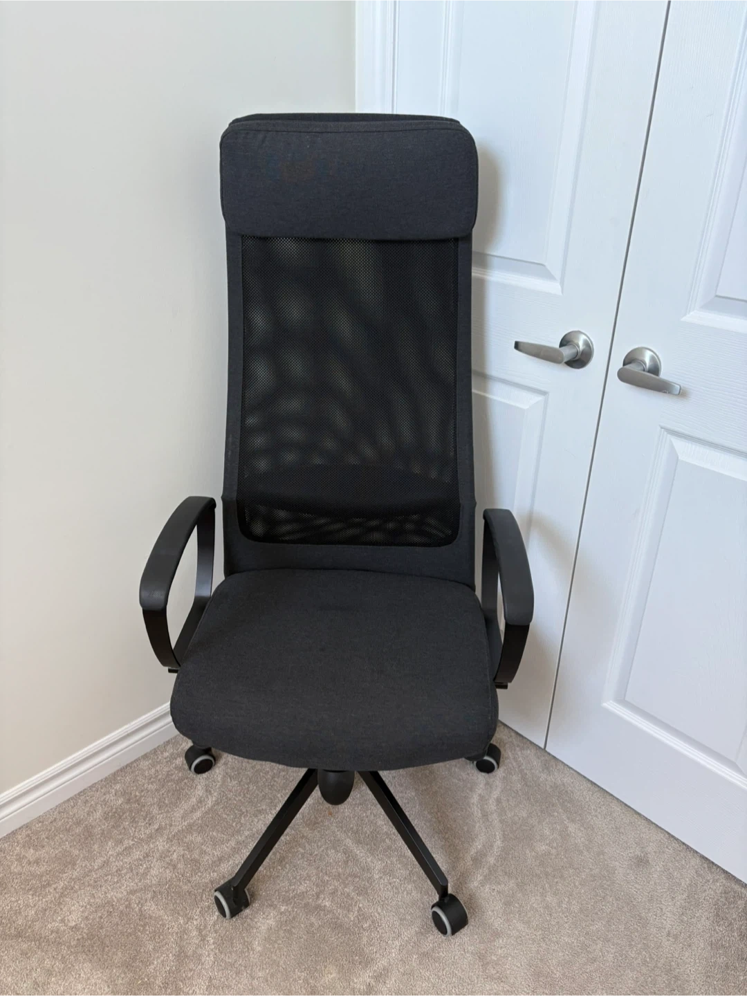 This dark grey office chair has a mesh back and a padded headrest. Its seat is also padded for comfort. It's on wheels for easy movement. The chair's mesh back allows for good airflow.