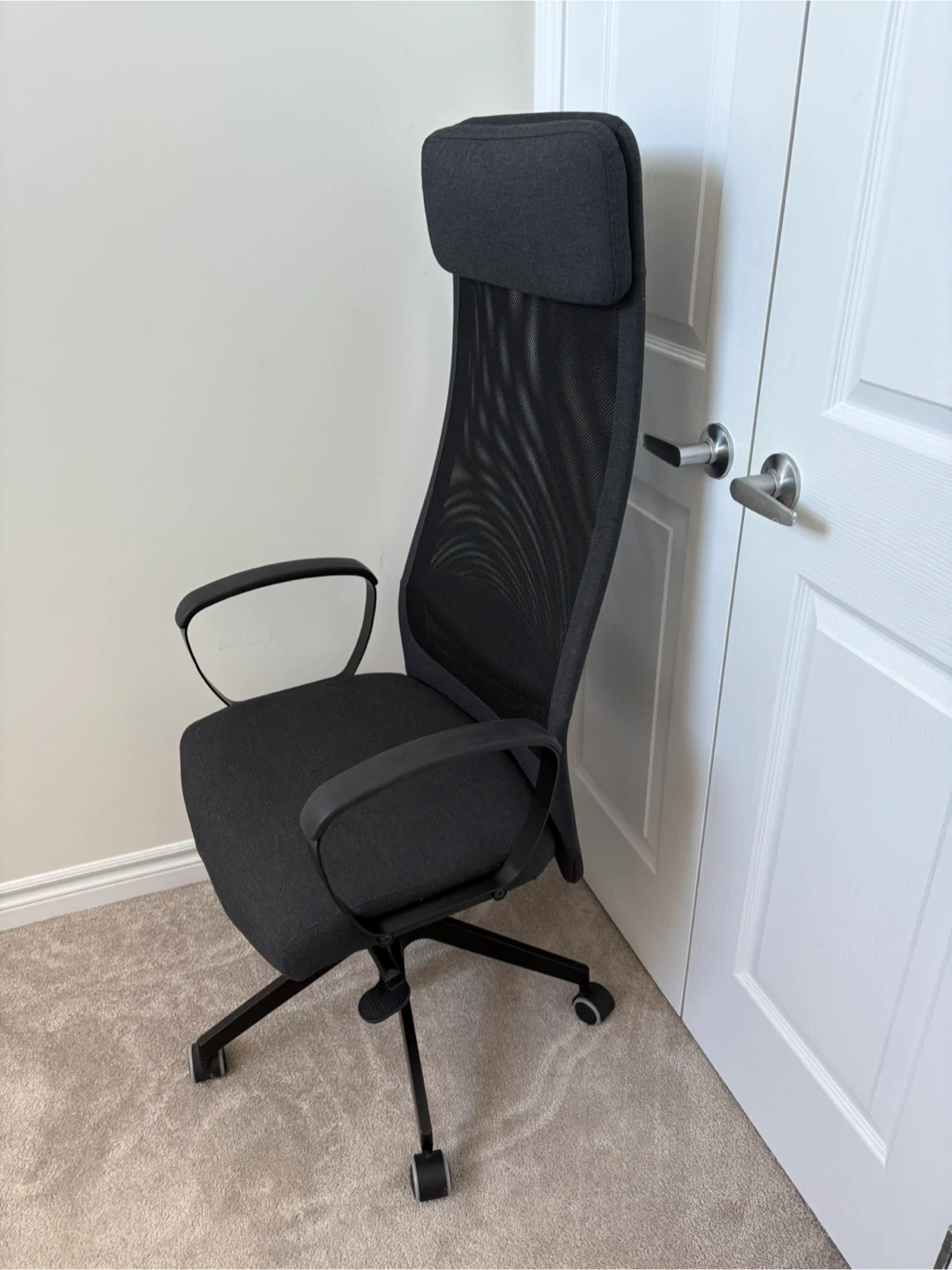 This dark grey office chair has a mesh back and a padded headrest. Its seat is also padded for comfort. It's on wheels for easy movement. The chair's mesh back allows for good airflow.
