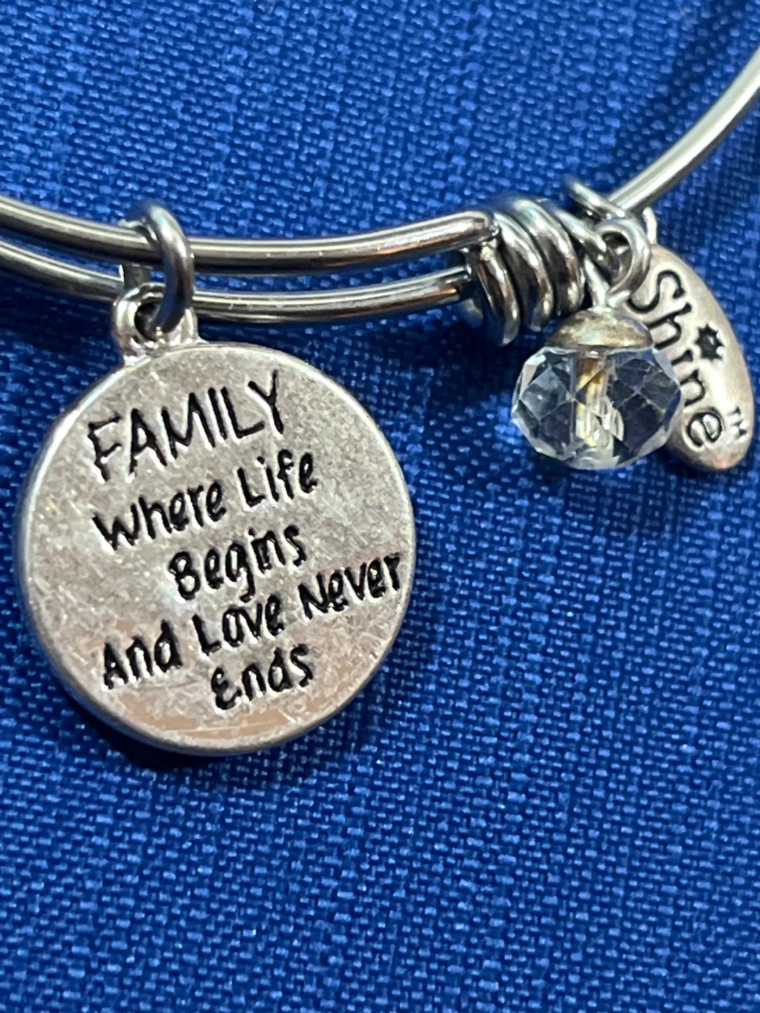 This silver-tone bangle bracelet features a circular charm with a tree design and a gold heart accent. It also has a charm that says 'Shine' and a pendant with the quote 'FAMILY Where Life Begins And Love Never Ends'. It's an adjustable bangle with a clear crystal bead.