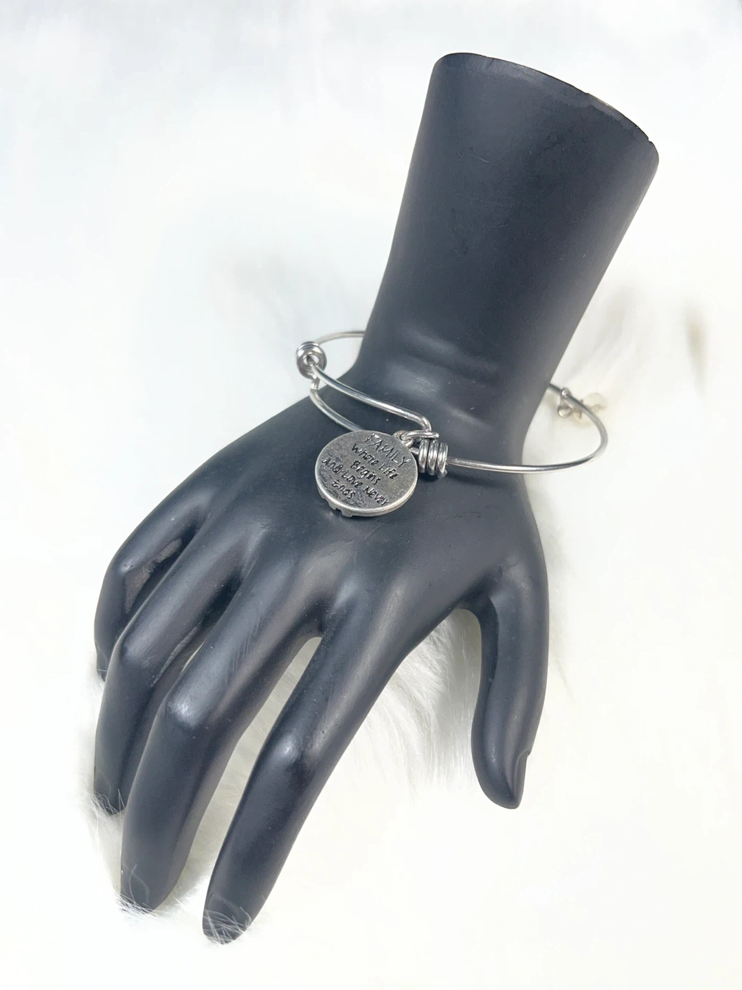 This silver-tone bangle bracelet features a circular charm with a tree design and a gold heart accent. It also has a charm that says 'Shine' and a pendant with the quote 'FAMILY Where Life Begins And Love Never Ends'. It's an adjustable bangle with a clear crystal bead.