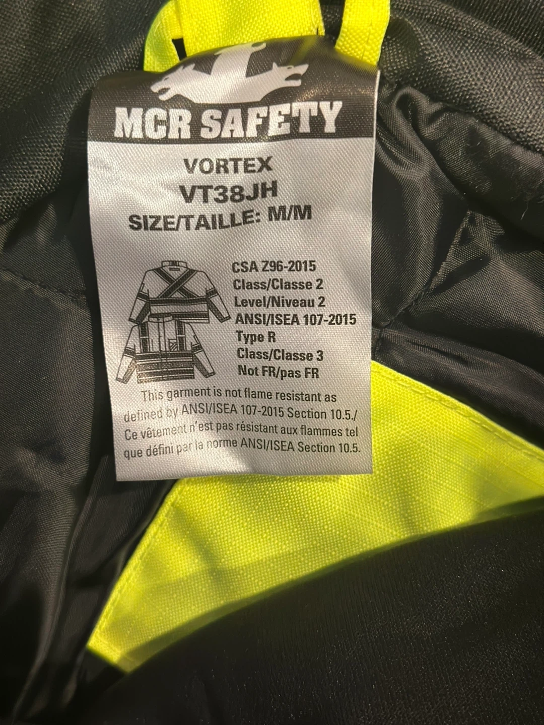 This is an MCR Safety Vortex VT38JH jacket in size M/M. It's designed with CSA Z96-2015 Class 2 and ANSI/ISEA 107-2015 Type R standards. The garment isn't flame resistant as defined by ANSI/ISEA 107-2015. Insulated jacket