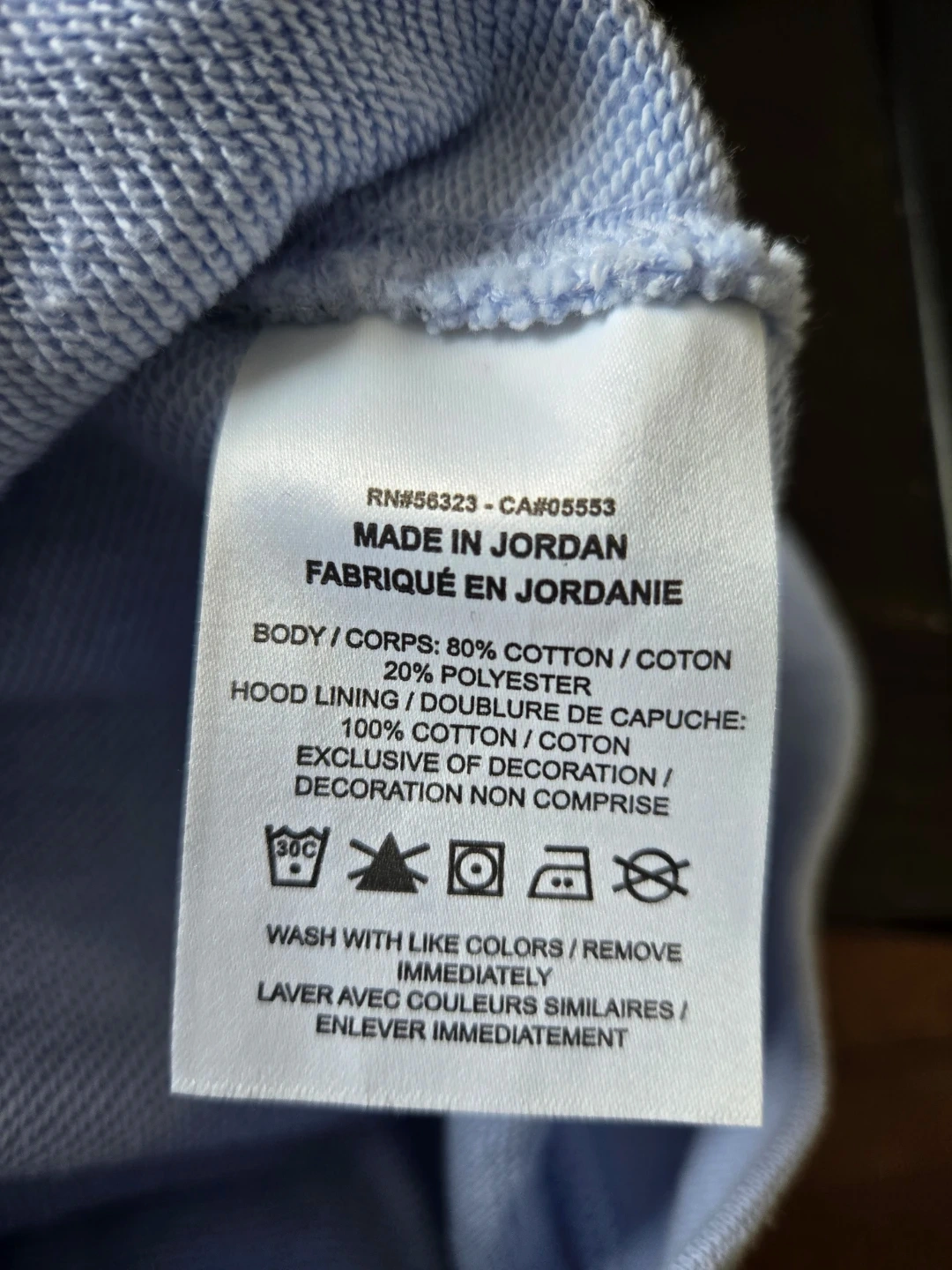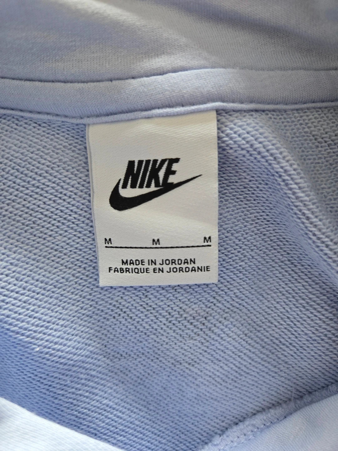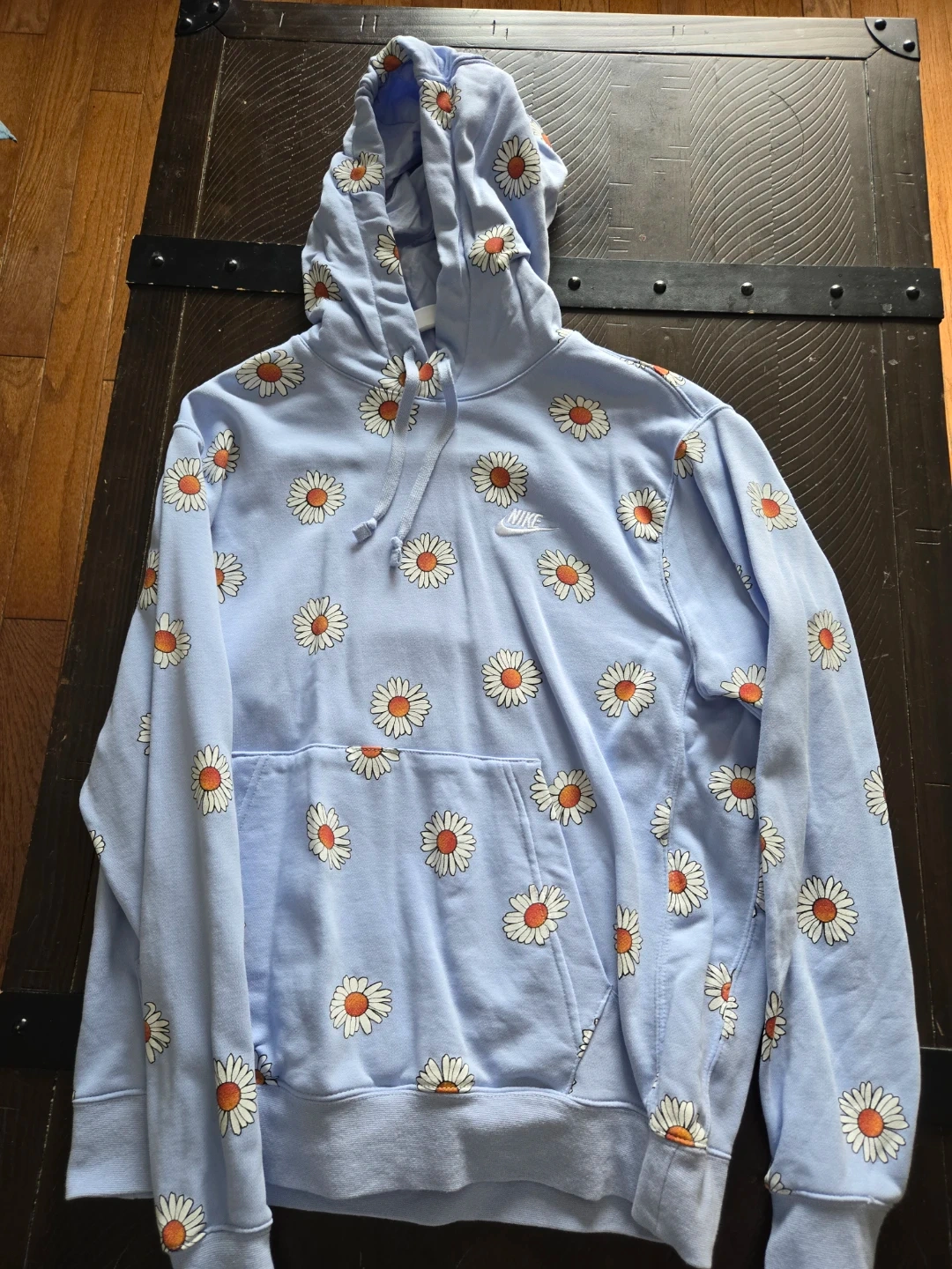 Light blue Nike hoodie with a repeating daisy print. Size medium. Made of 80% cotton and 20% polyester.
