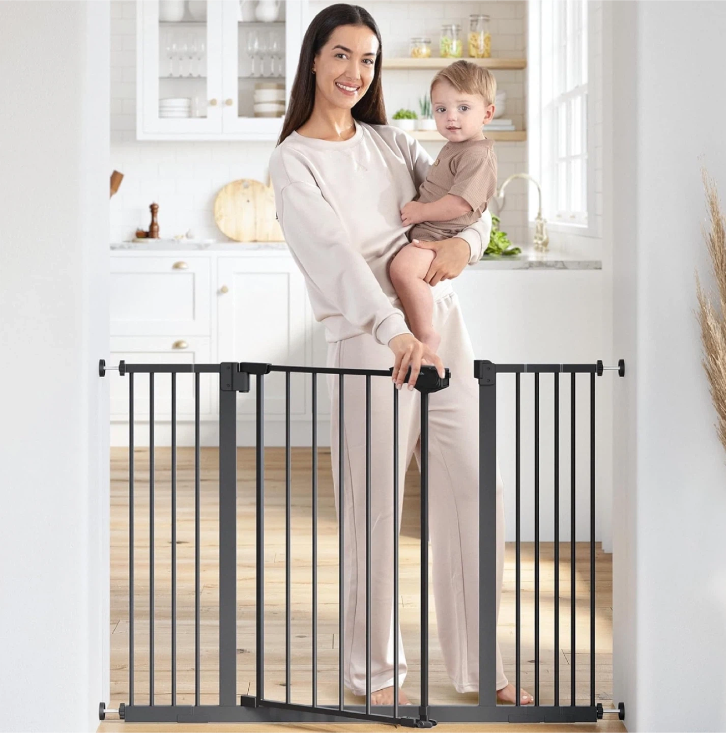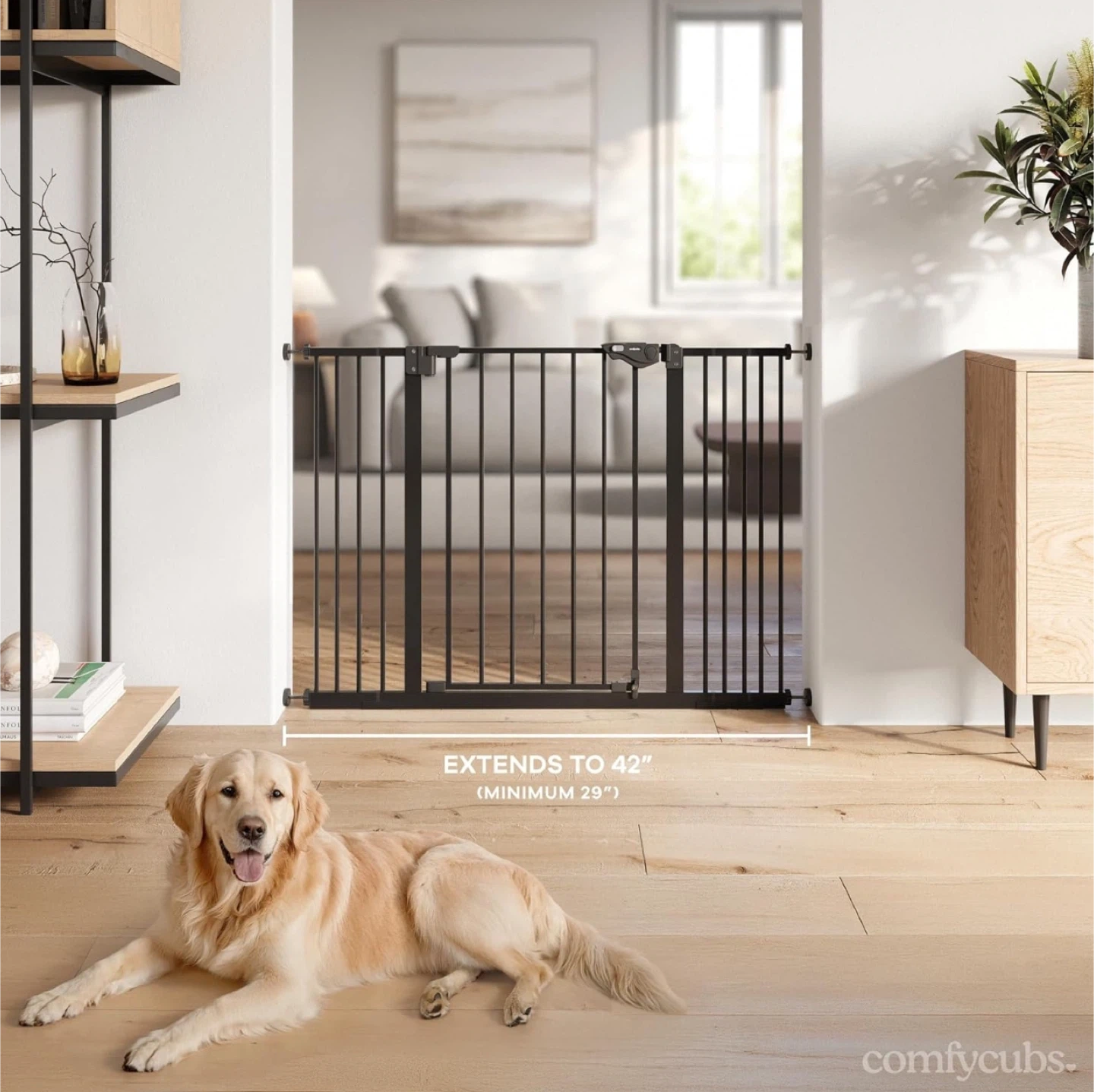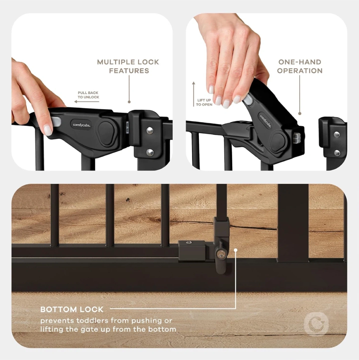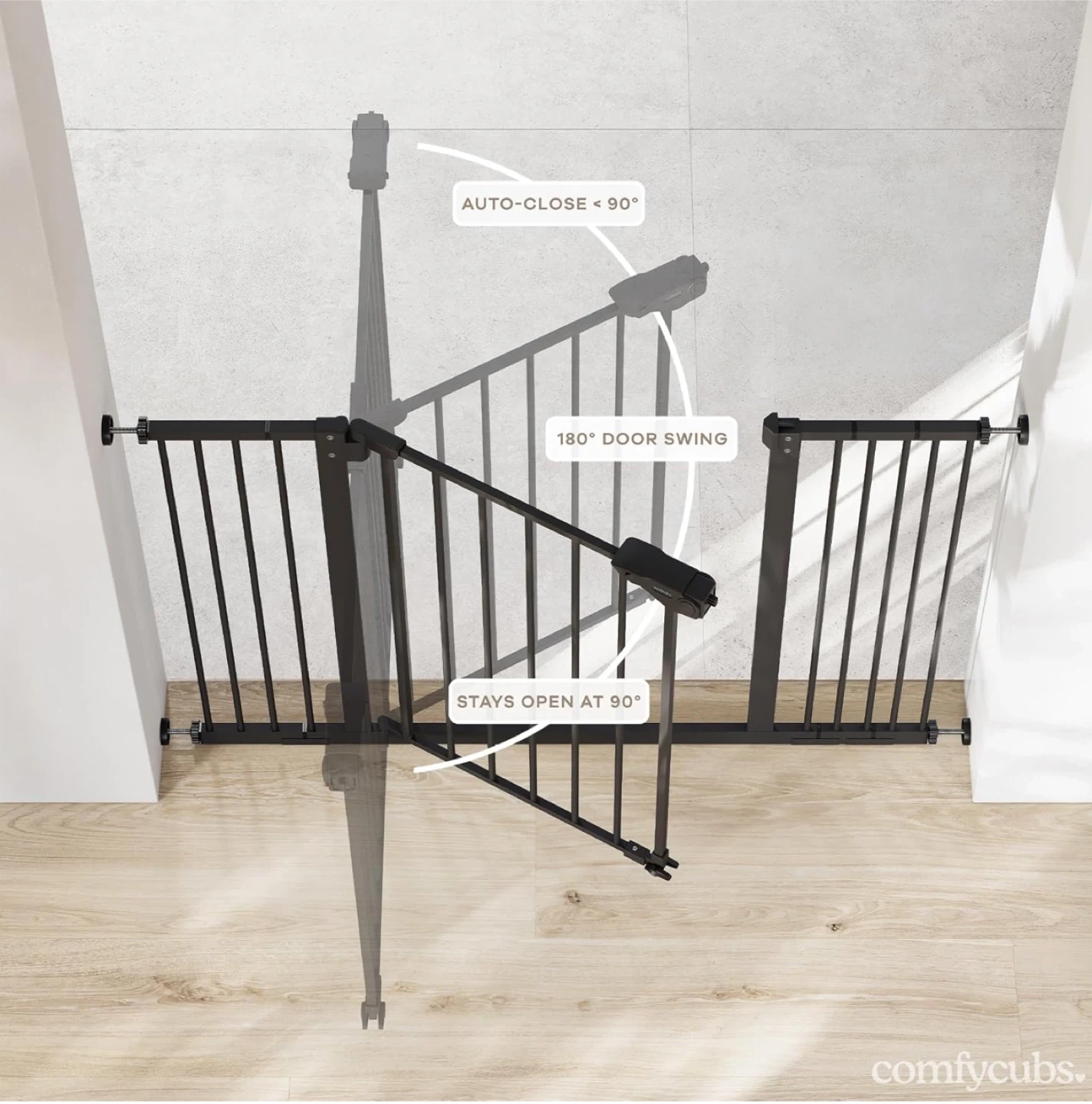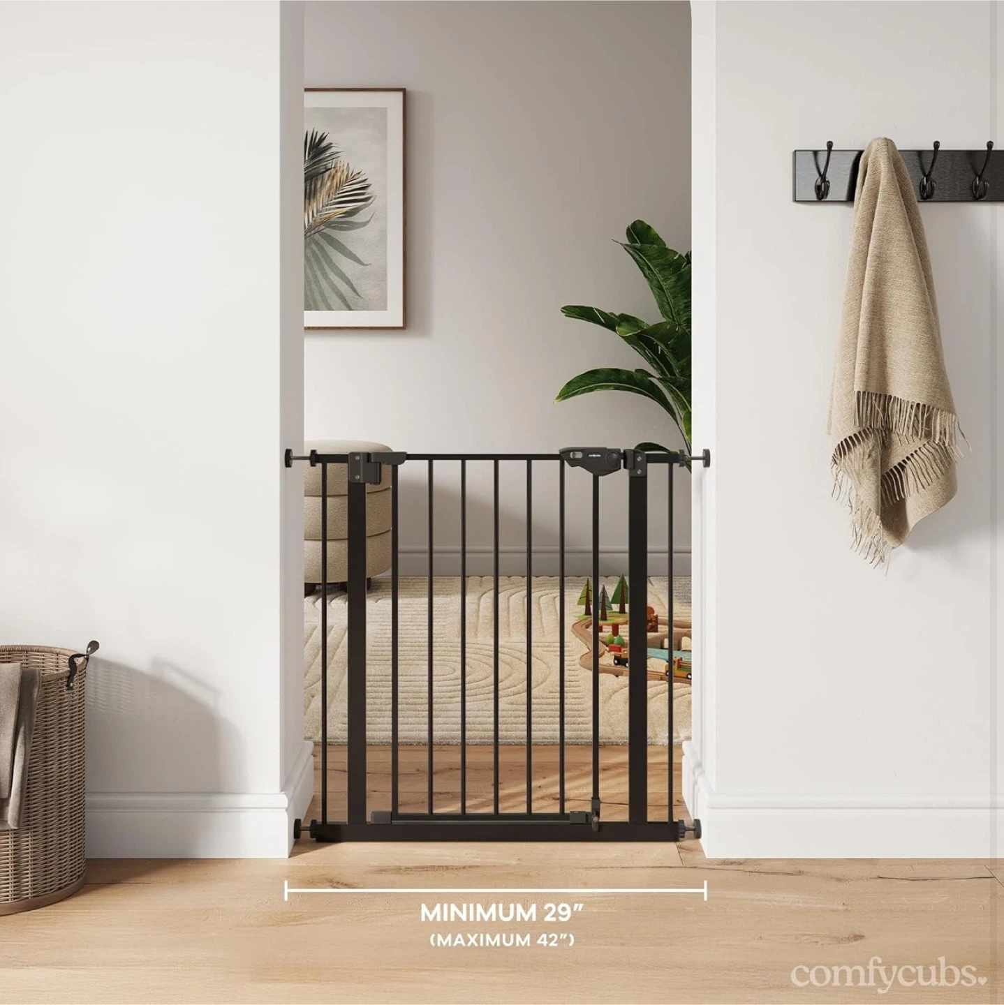 Comfy Cubs Adjustable Baby Gate - 3 Extensions 107 x 5 x 76 cm, Multipurpose Q195 Steel Stair Gate - Powder-Coated Stair Barrier, Walk Through Design for Kids & Pets, Fits Staircases - Black
