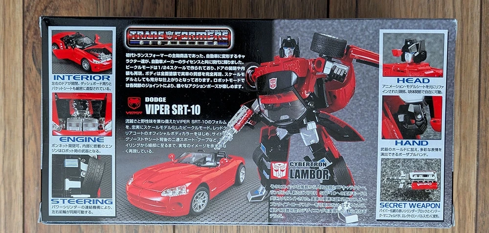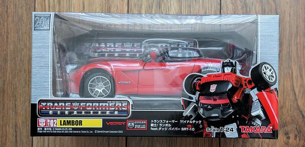 "Lambor", BT-02, from the Transformers Binaltech line, brand new, factory sealed. Modelled after a red Dodge Viper SRT-10 in 1:24 scale.