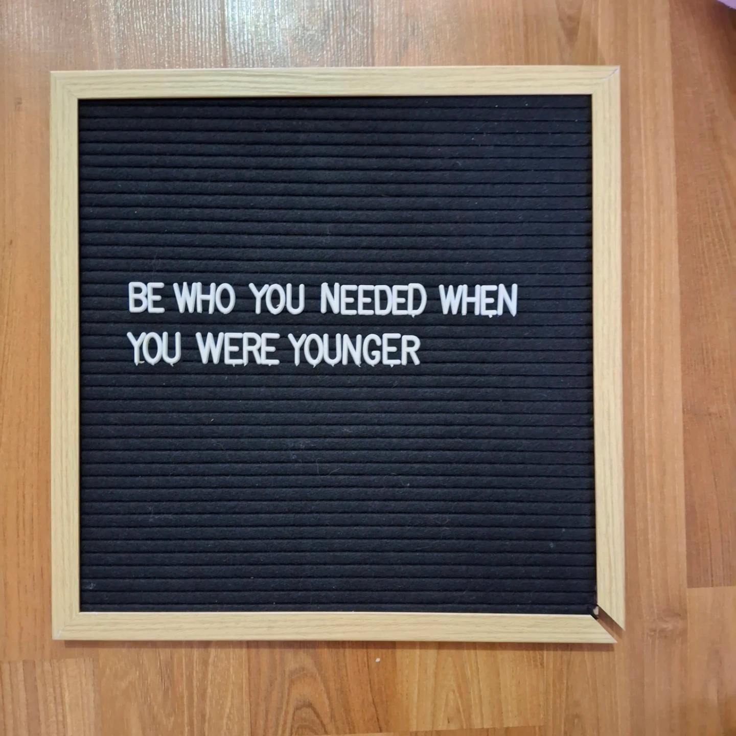 This black felt letter board features a light wood frame. It comes with white letters to display custom messages. The quote reads 'BE WHO YOU NEEDED WHEN YOU WERE YOUNGER'. Display your favourite sayings or affirmations!