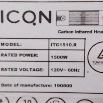 ICON Carbon Infrared Heater, model ITC1510.R, rated at 1500W. Features 3D heating technology and carbon filament for rapid heating. It's IP34 rated and has a tip-over safety switch.