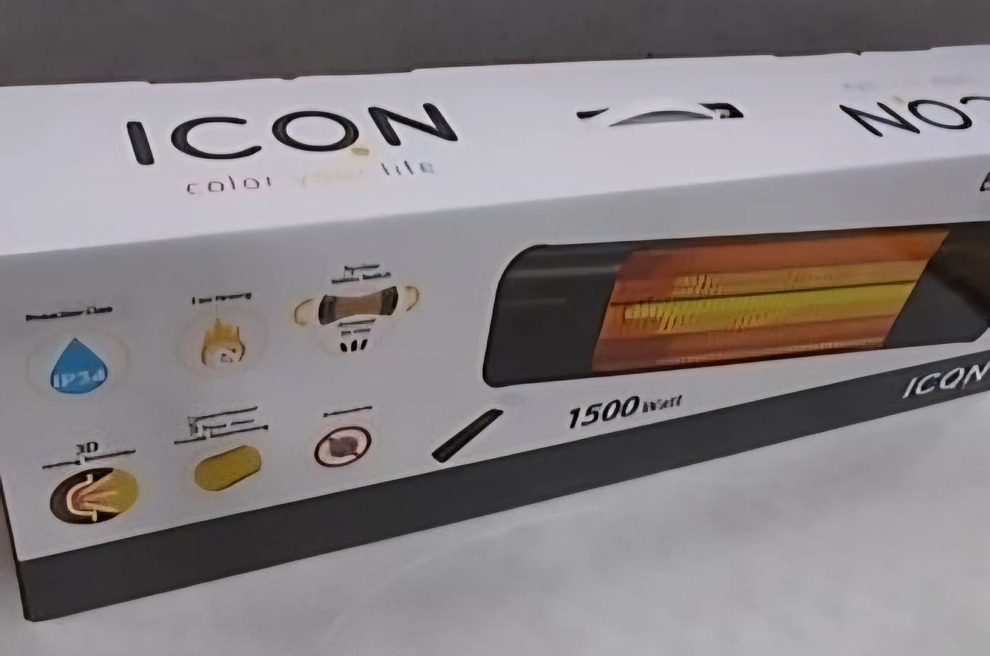 ICON Carbon Infrared Heater, model ITC1510.R, rated at 1500W. Features 3D heating technology and carbon filament for rapid heating. It's IP34 rated and has a tip-over safety switch.