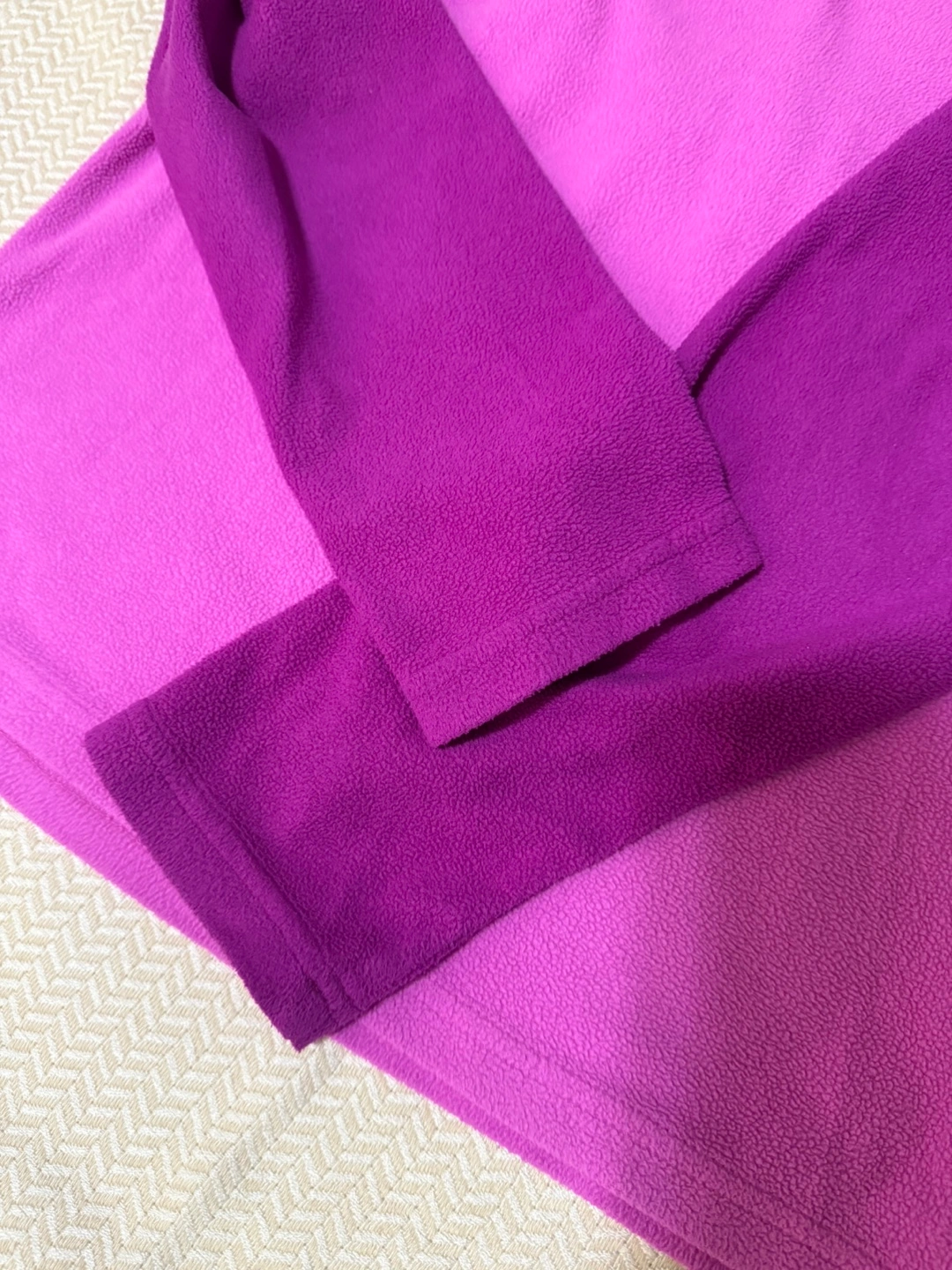 Columbia fleece pullover in two shades of purple. Size medium. Soft fleece material for warmth.