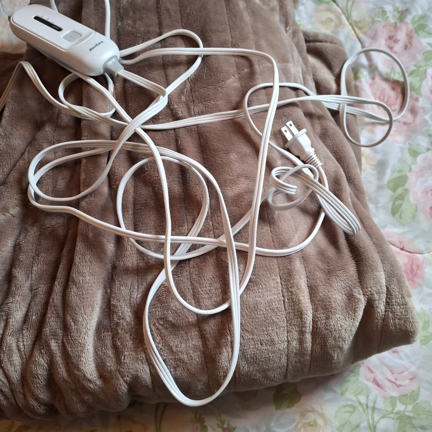 This is a plush electric heated blanket from MaxKare. It's a soft, brown colour and comes with a controller for adjustable settings. It's perfect for staying warm on chilly nights!