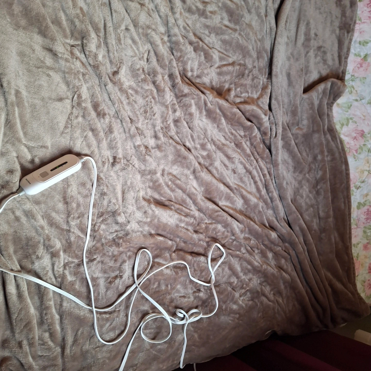 This is a plush electric heated blanket from MaxKare. It's a soft, brown colour and comes with a controller for adjustable settings. It's perfect for staying warm on chilly nights!