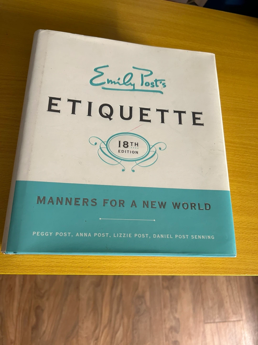 Emily Post's Etiquette, 18th Edition. This book covers manners for a new world. It's authored by Peggy Post, Anna Post, Lizzie Post, and Daniel Post Senning.
