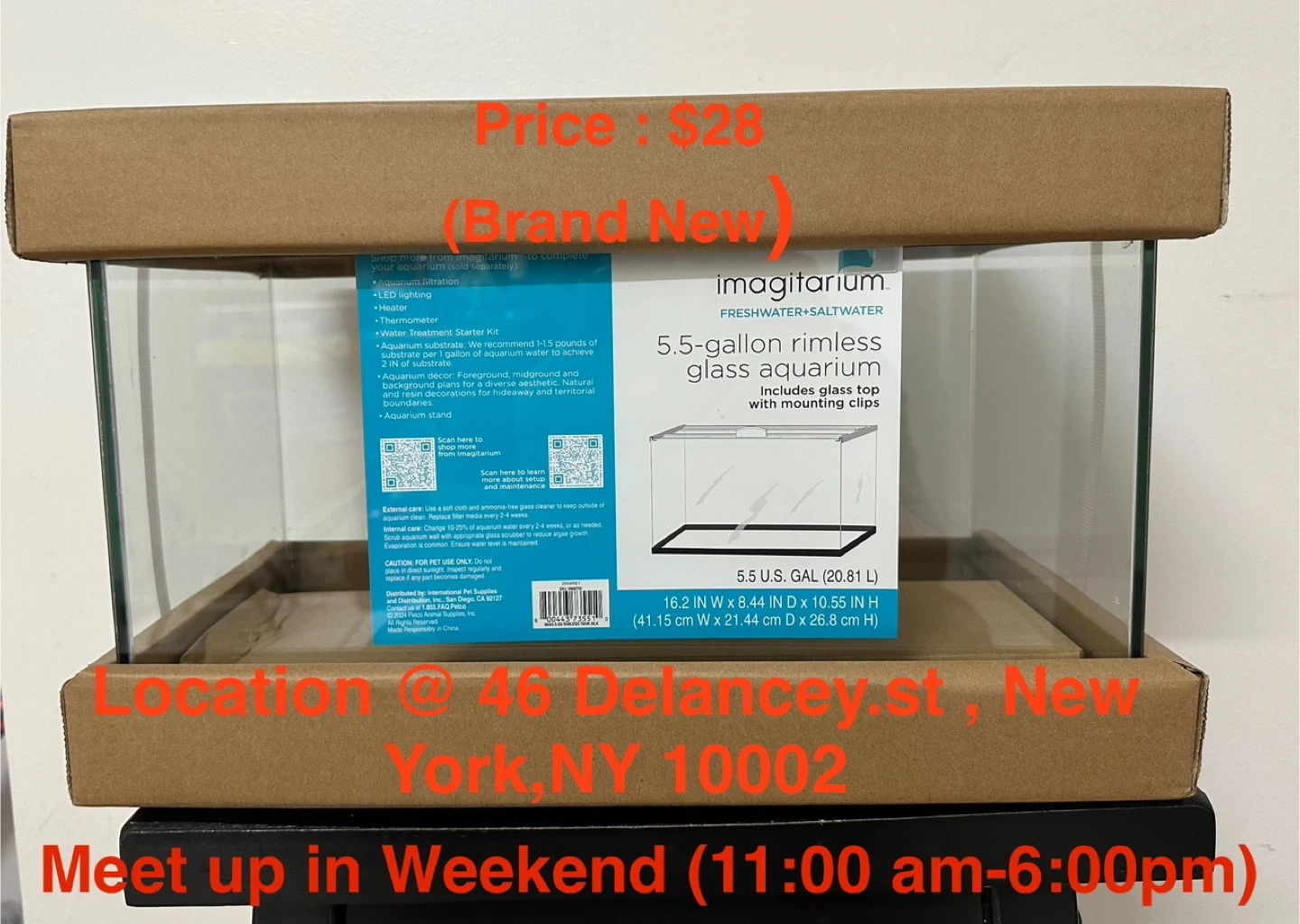 Brand new Imagitarium 5.5-gallon rimless glass aquarium. It's freshwater and saltwater compatible and includes a glass top with mounting clips. Dimensions are 16.2" W x 8.44" D x 10.55" H.