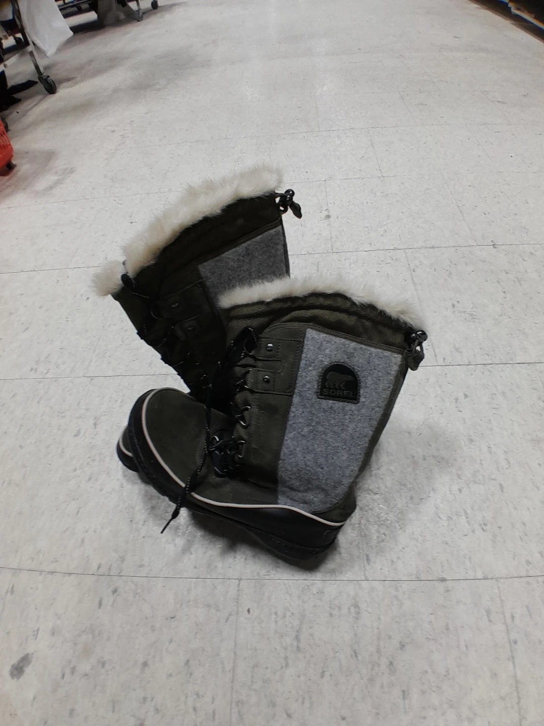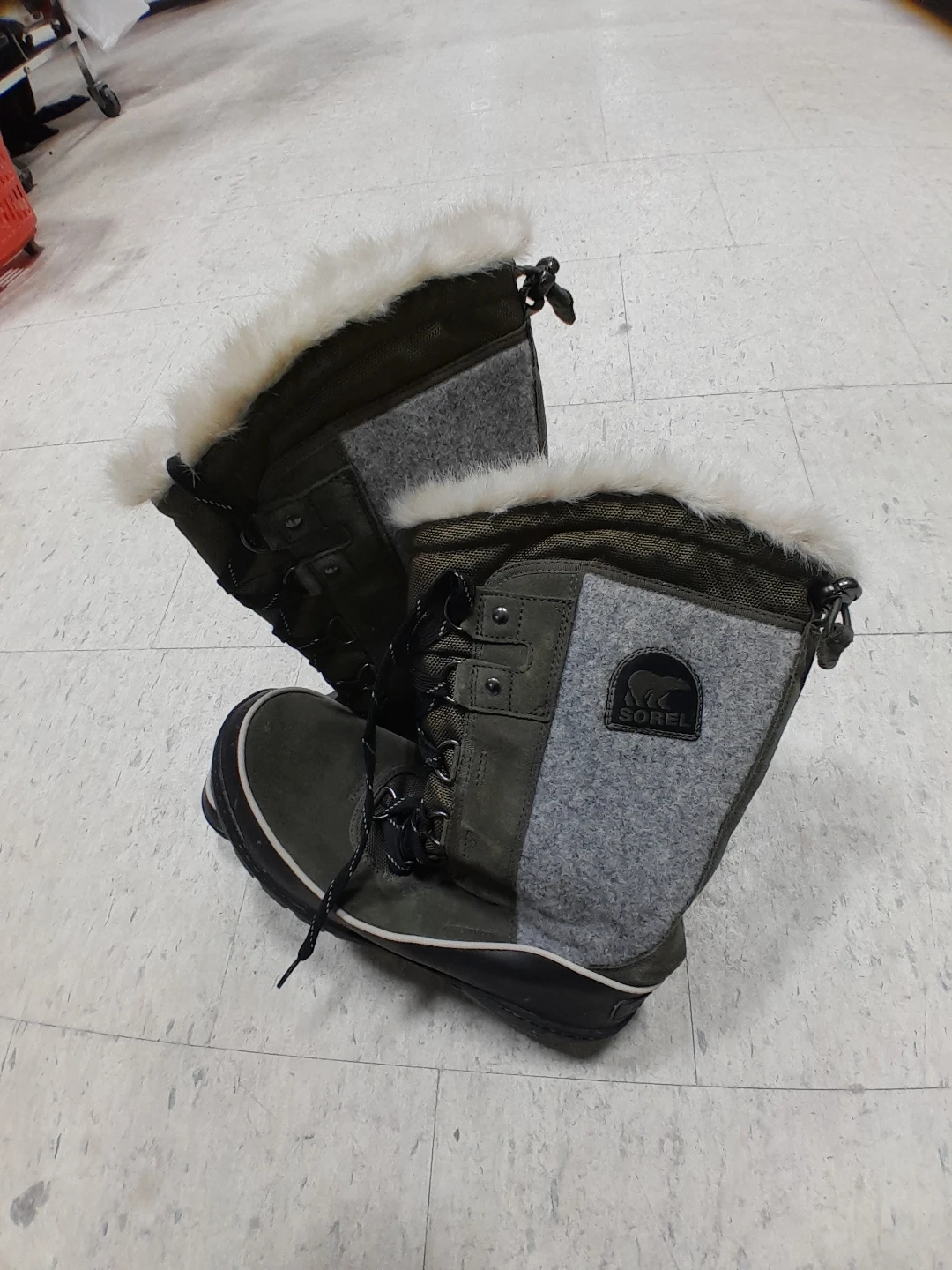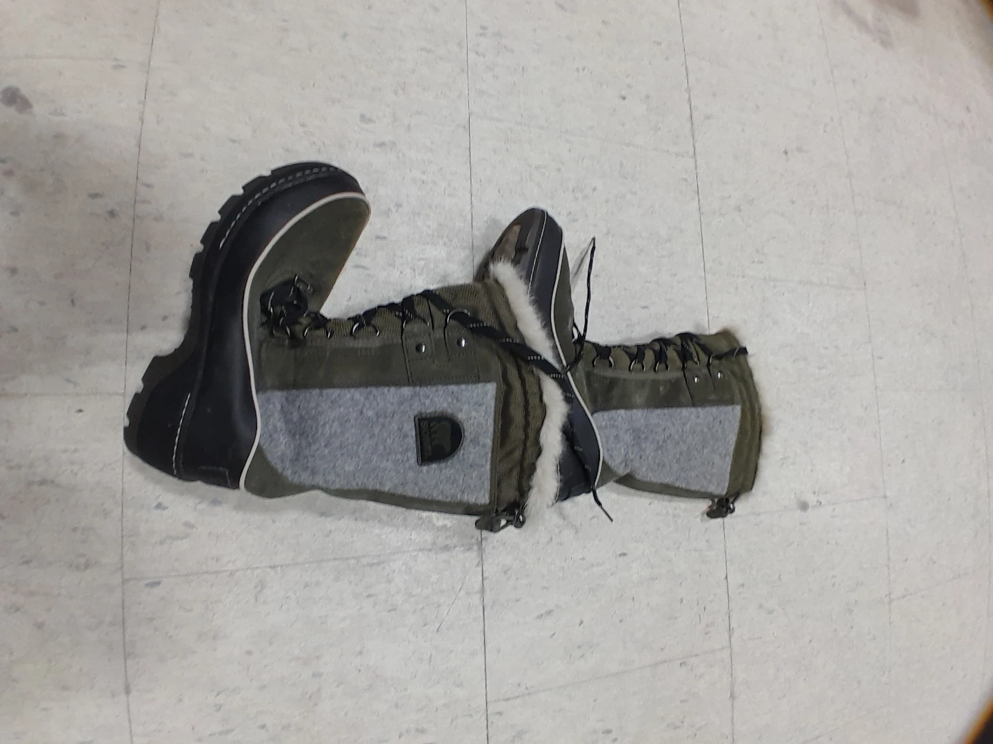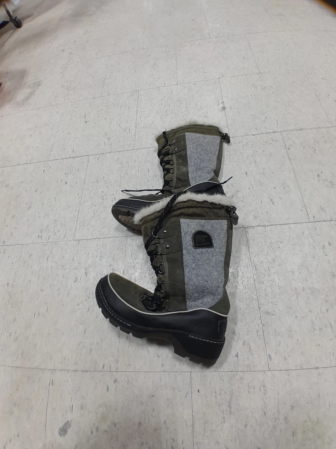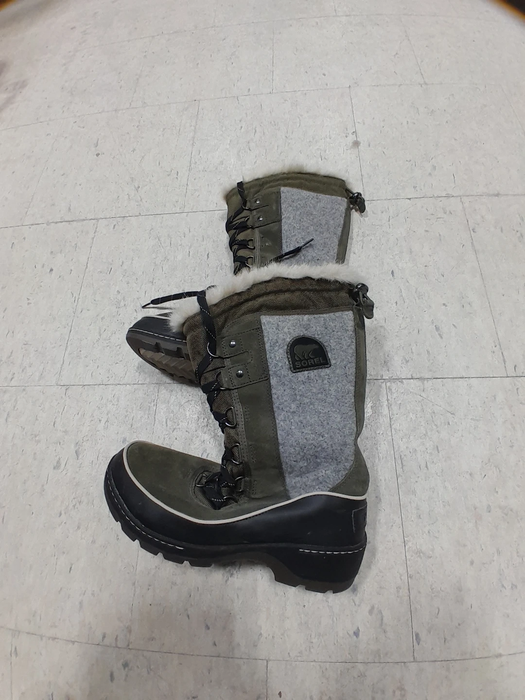 Warm and waterproof Sorel winter boots. Olive green colour with grey felt accents and faux fur trim. Lace-up front closure for a secure fit. Excellent for cold weather! These boots are a size 10