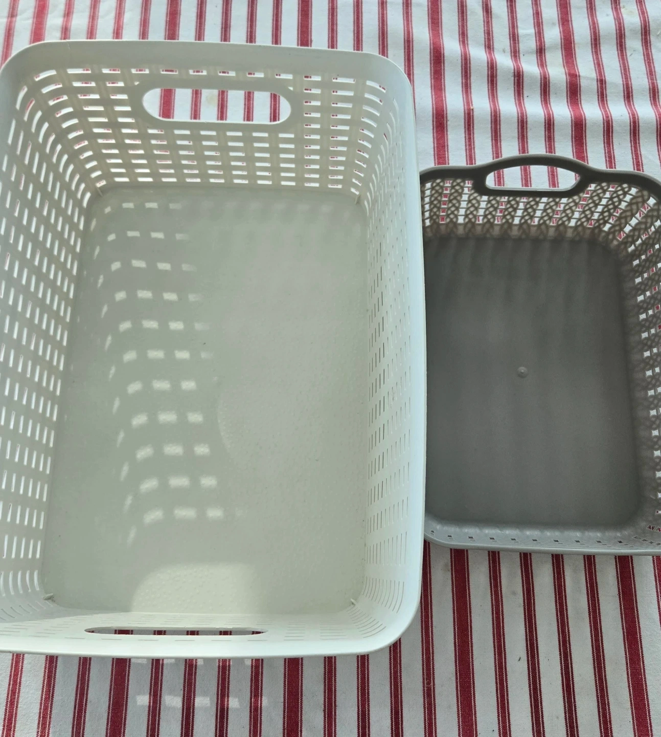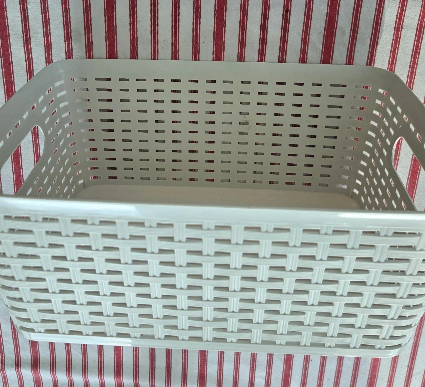 White plastic storage basket with a slatted design and built-in handles. It's great for organizing various items around the house. Plastic material. 2pic