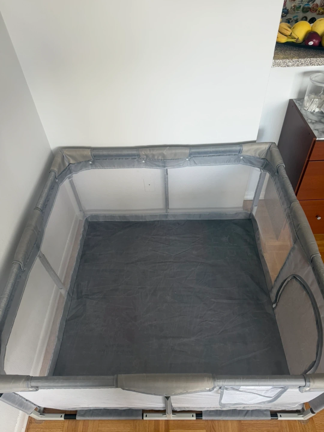 It's made with a sturdy frame and mesh sides for visibility. It has a zippered door for easy access. This playpen is great for keeping little ones safe and entertained.