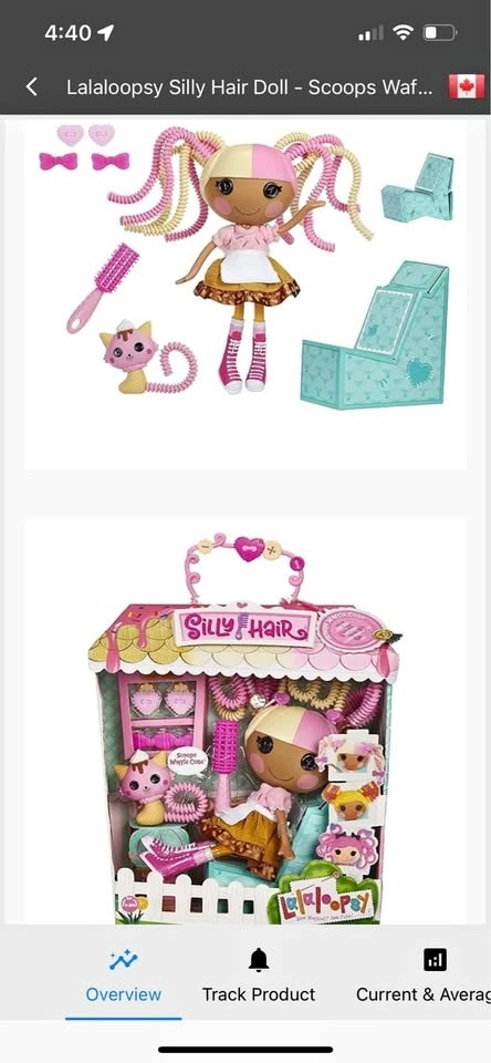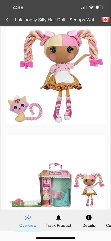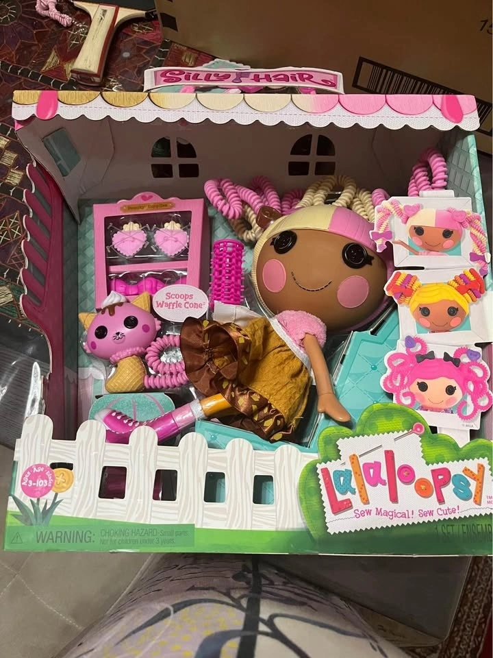Brand new in box Lalaloopsy Silly Hair Doll - Scoops Waffle Cone with Pet Cat. This is a 13" ice cream theme hair styling doll with multicolor hair and 11 accessories. Comes in a reusable salon package playset. Suitable for ages 3-103.