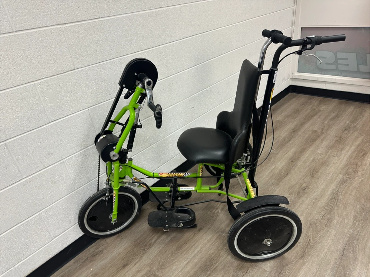 This adaptive tricycle is designed to assist with mobility. It features a comfortable seat and hand-operated controls for steering and braking. The sturdy frame ensures stability for riders.