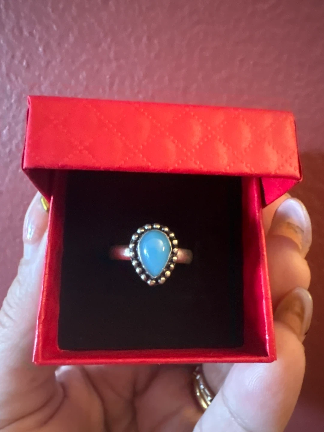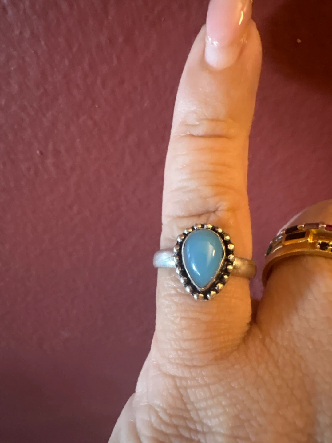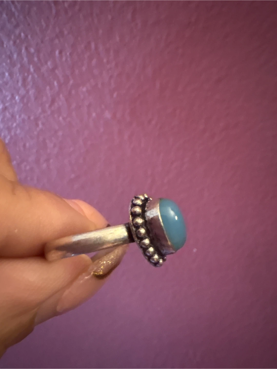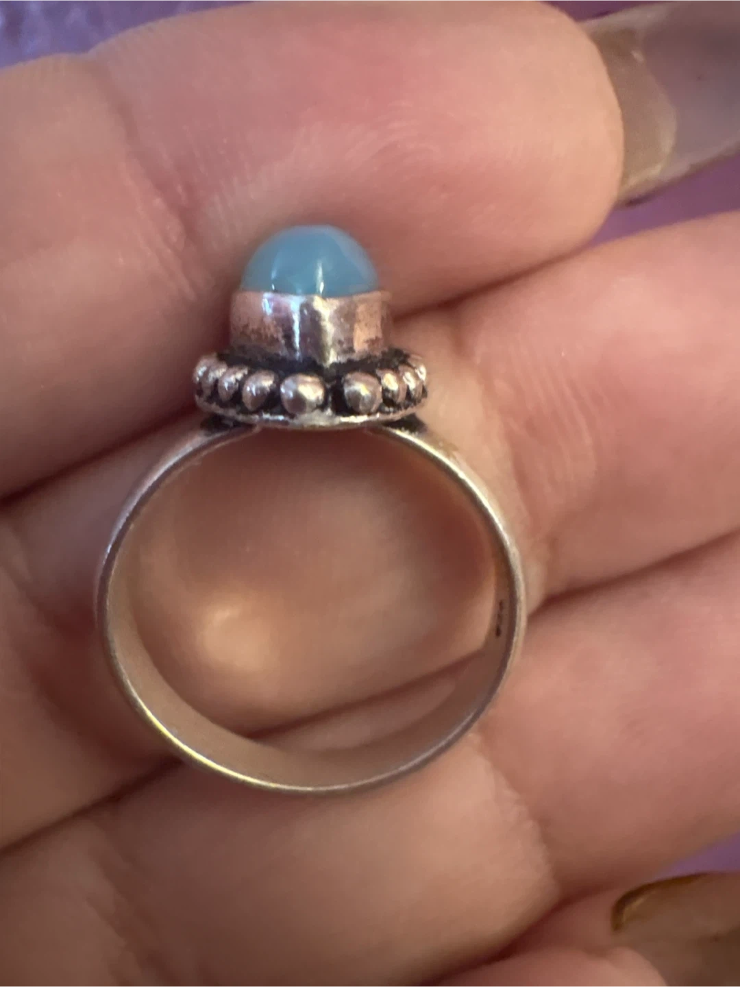 This ring features a silver 925 band with a smooth, polished blue stone. It's set in a decorative silver bezel with beaded detailing. Appears to be artisan-made. New