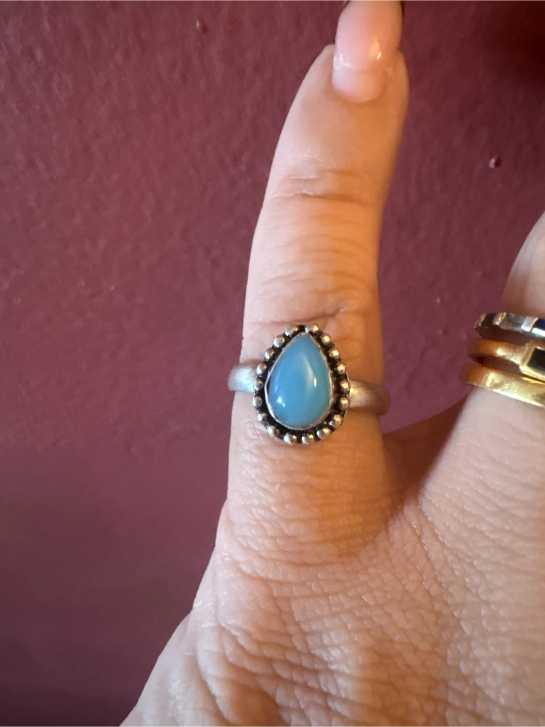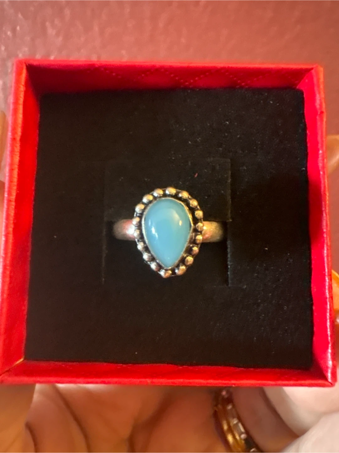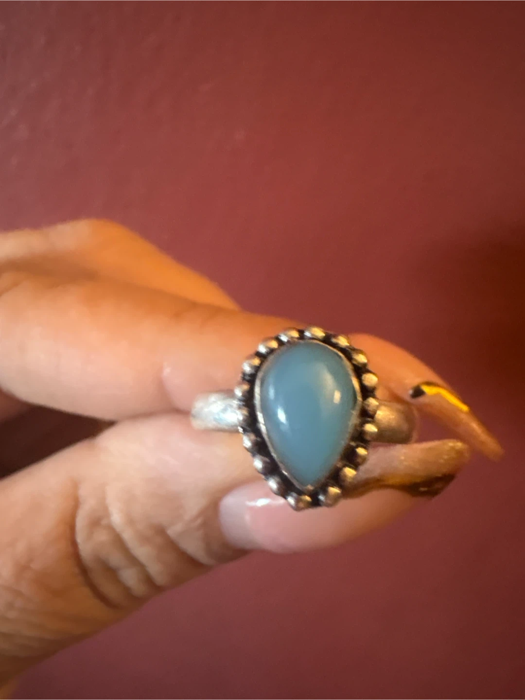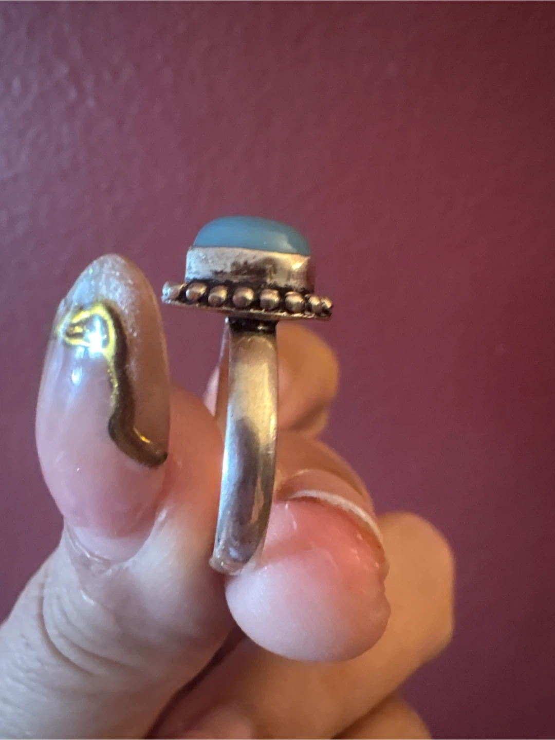 This ring features a silver 925 band with a smooth, polished blue stone. It's set in a decorative silver bezel with beaded detailing. Appears to be artisan-made. New