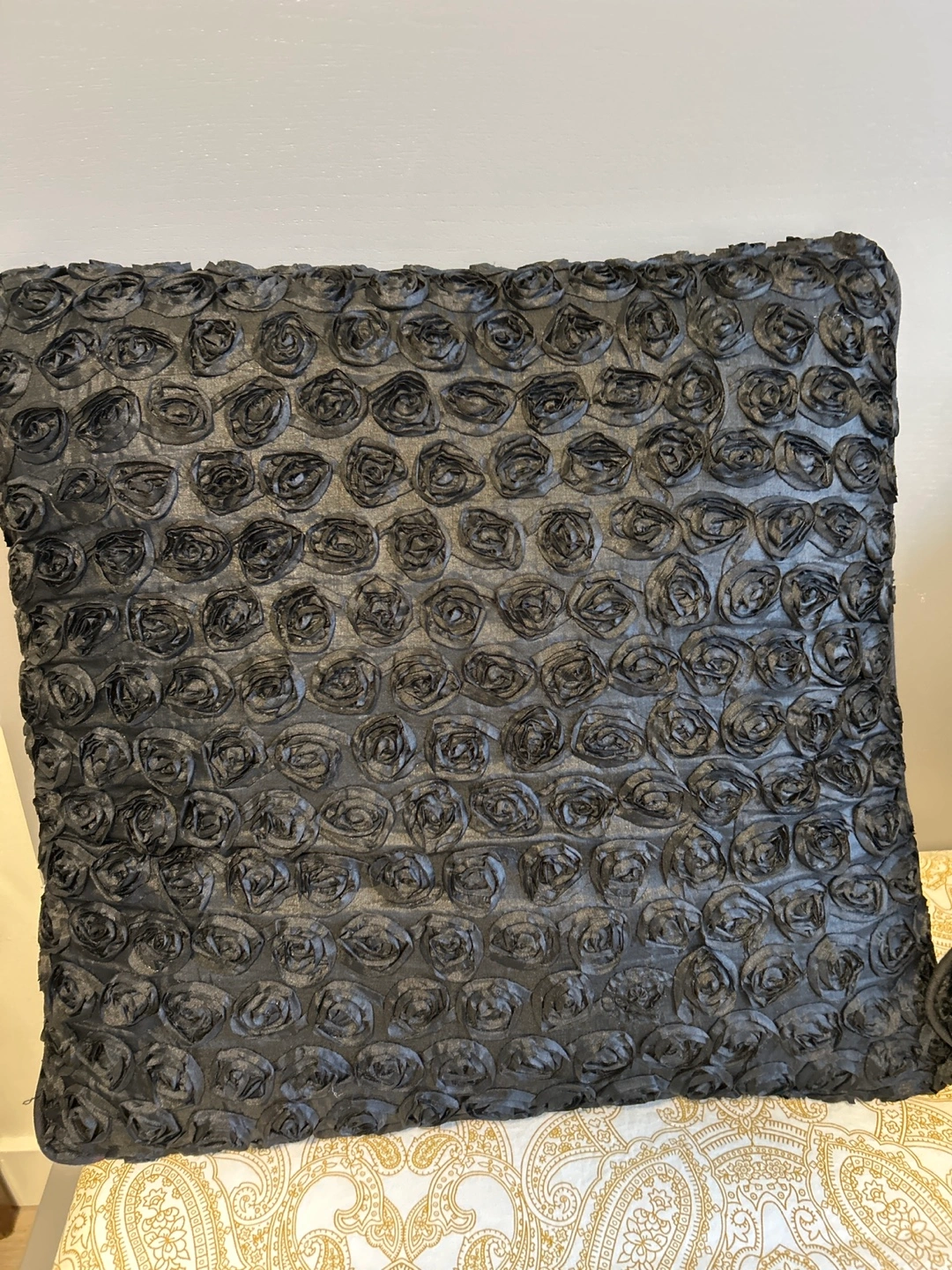 A decorative throw pillow with a textured black rose design. Its unique floral pattern adds a touch of elegance to any room. The pillow's material gives it a lovely sheen. Perfect for accenting a couch or bed! 4$ each