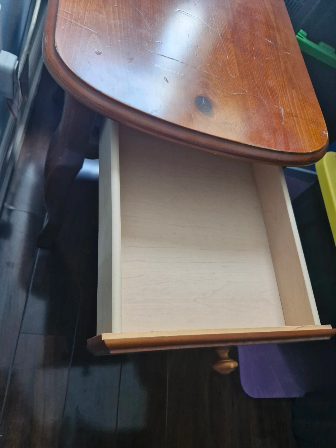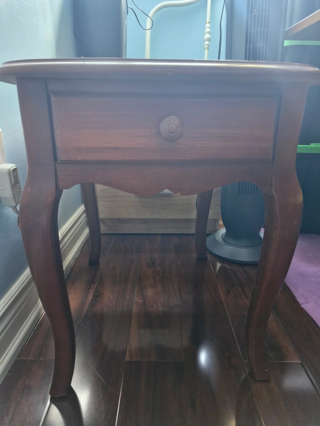 A classic wooden side table with a single drawer. Its curved legs and simple design make it a versatile piece for any room. Plenty of space for essentials!