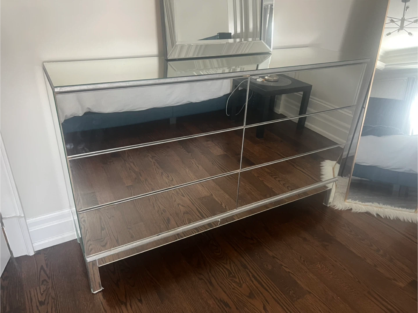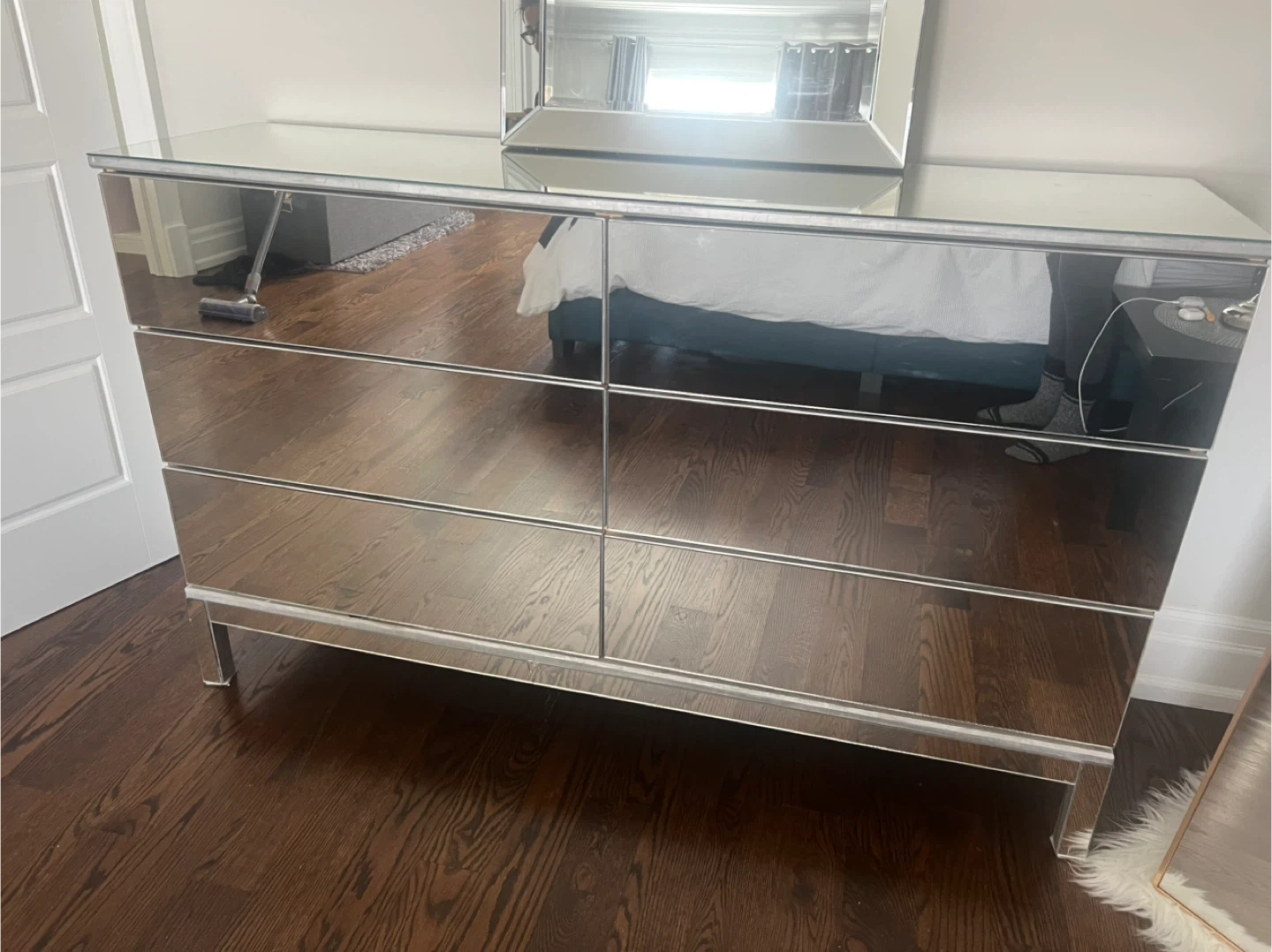 This mirrored dresser has six drawers for ample storage. It's made with mirrored glass and has a sleek, modern design. Perfect for a bedroom or closet.