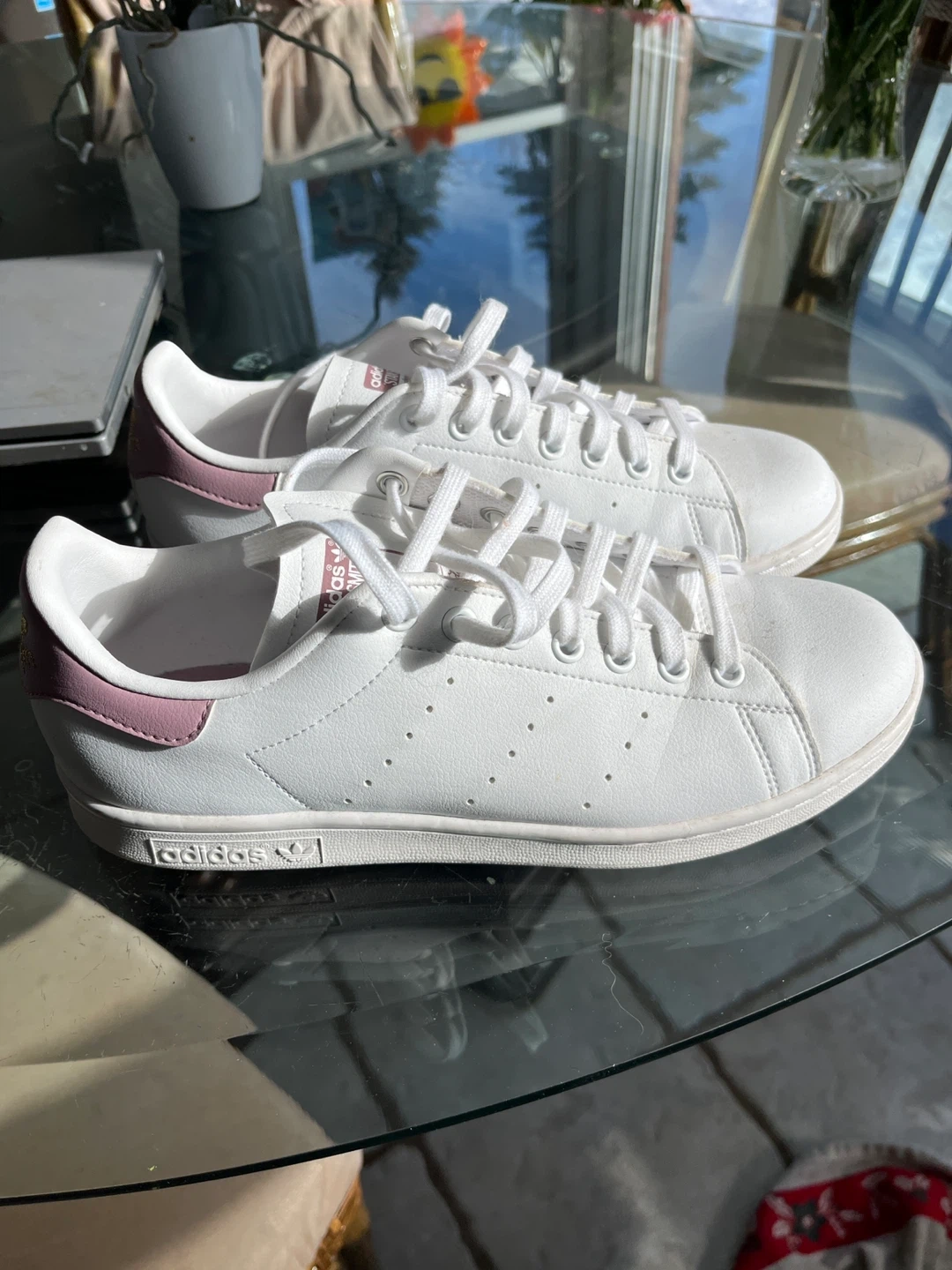 Classic Adidas Stan Smith sneakers in white with subtle lilac accents. These shoes are made from leather and feature the iconic Stan Smith design. They're great for everyday wear!