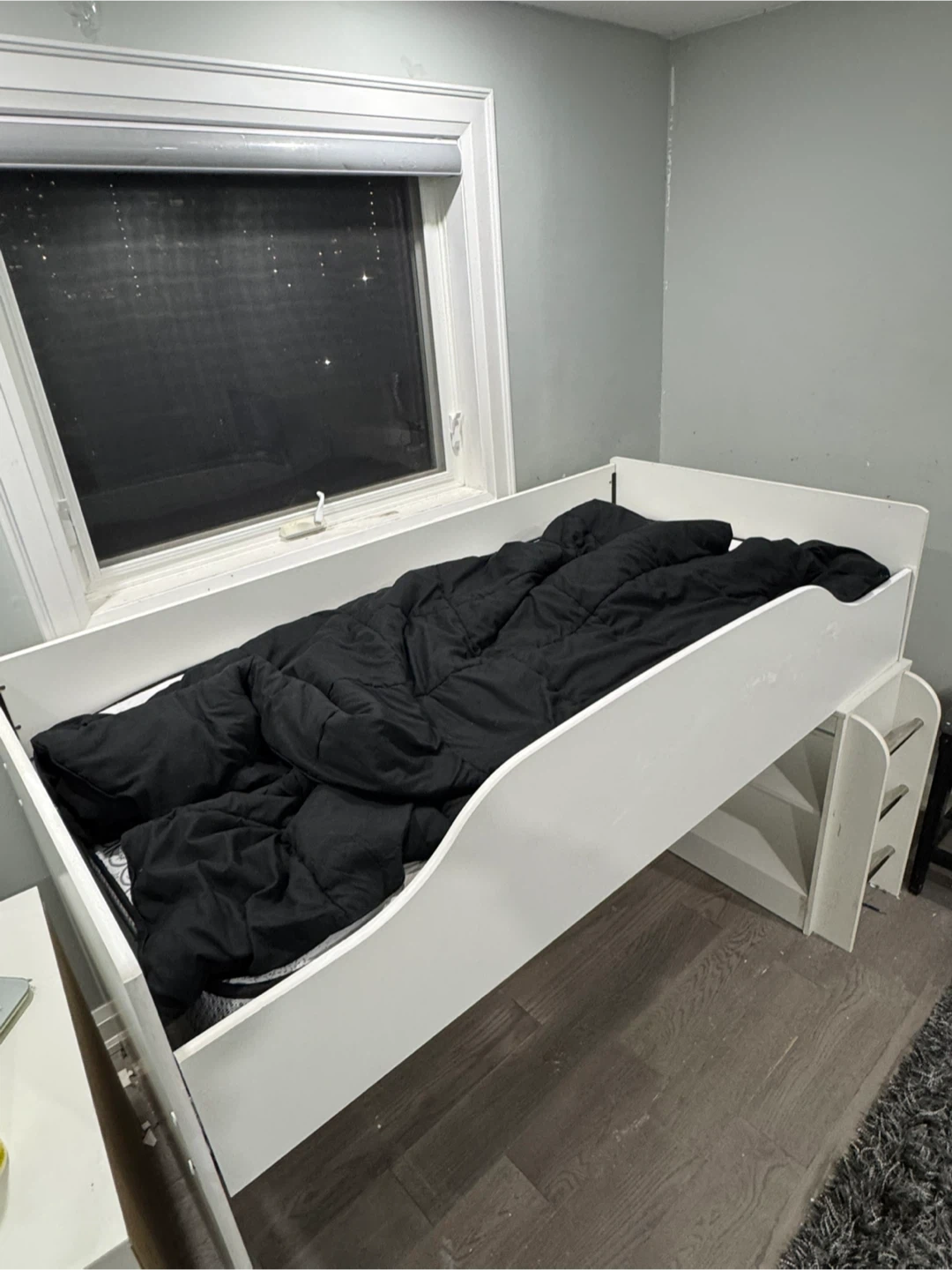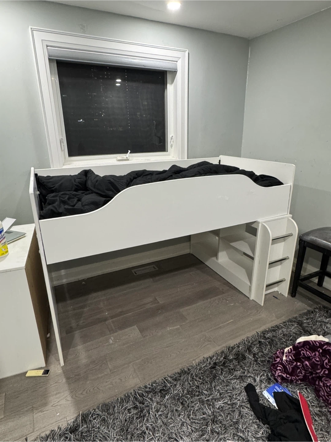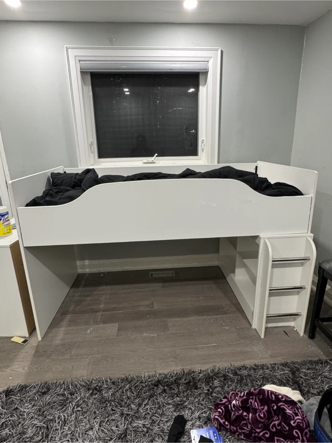 This white loft bed features built-in shelves for storage and a sturdy ladder for access. It's made of wood composite material. The bed frame is designed for a twin-sized mattress. This would be great for a child's bedroom!