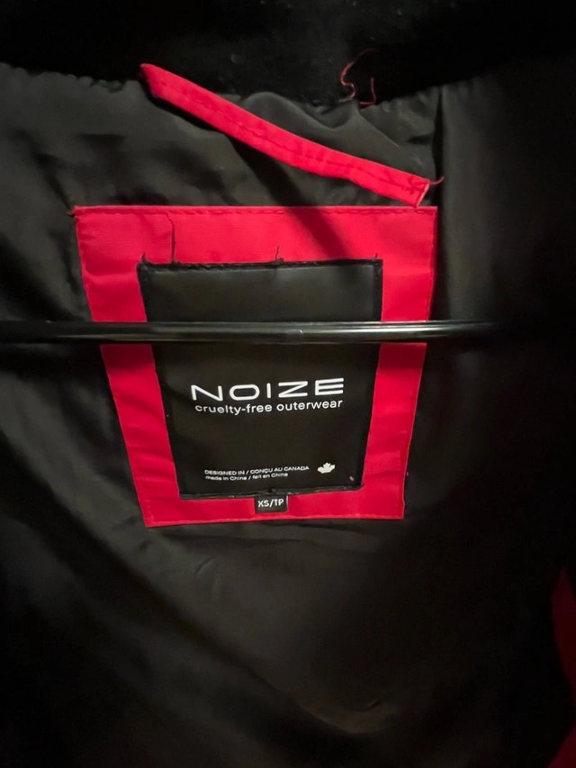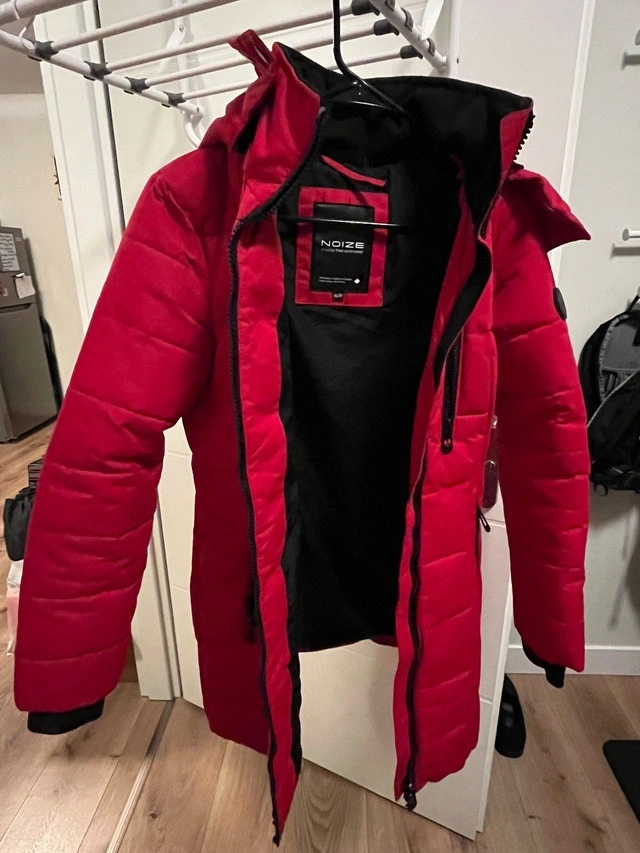 Selling a NOIZE winter jacket in bright red. Warm, insulated puffer-style coat with a hood, great for winter. Overall in good condition and still very wearable. Please note: The hanging loop/hook is broken. There is some wear on the leather trim near the zipper (purely cosmetic, zipper works fine). Details: Brand: NOIZE, Color: Red with black lining, Size: X-Small. Zipper closure with pockets. Clean and well cared for. Selling as it doesn’t fit me anymore. Open to reasonable offers. Pet free and smoke free home.